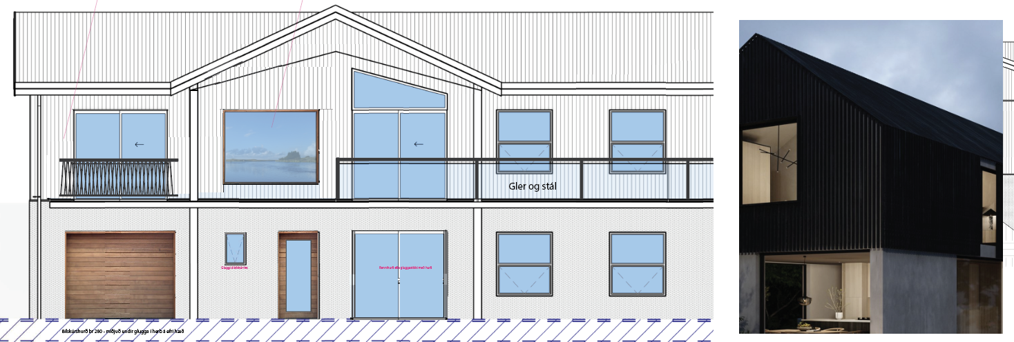 use the style and colirs of the house to the right to generate this drawing use the dark siding on the top floor and the painted color on th lower floor to generate go back to the previous color for the lower floor take out the green on the lower floor and have it sandgrey hafe all the fittings dark on the house this is good just make the great helpgrey doors on the lower floor as glass sliding door window