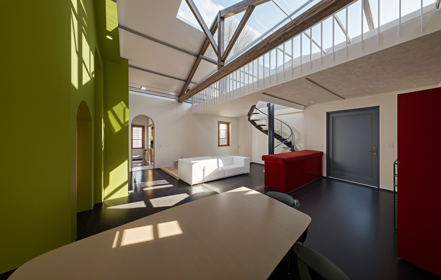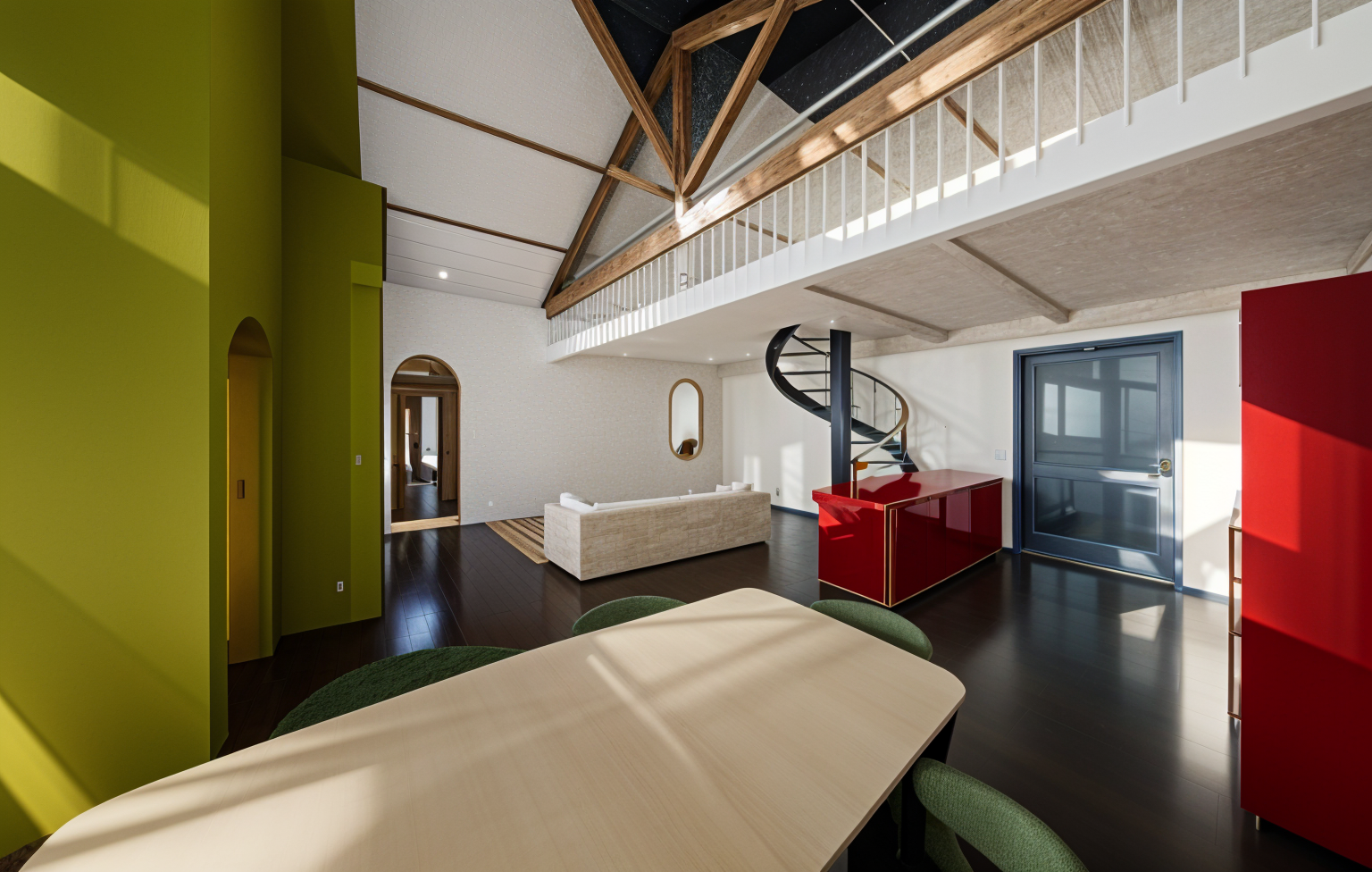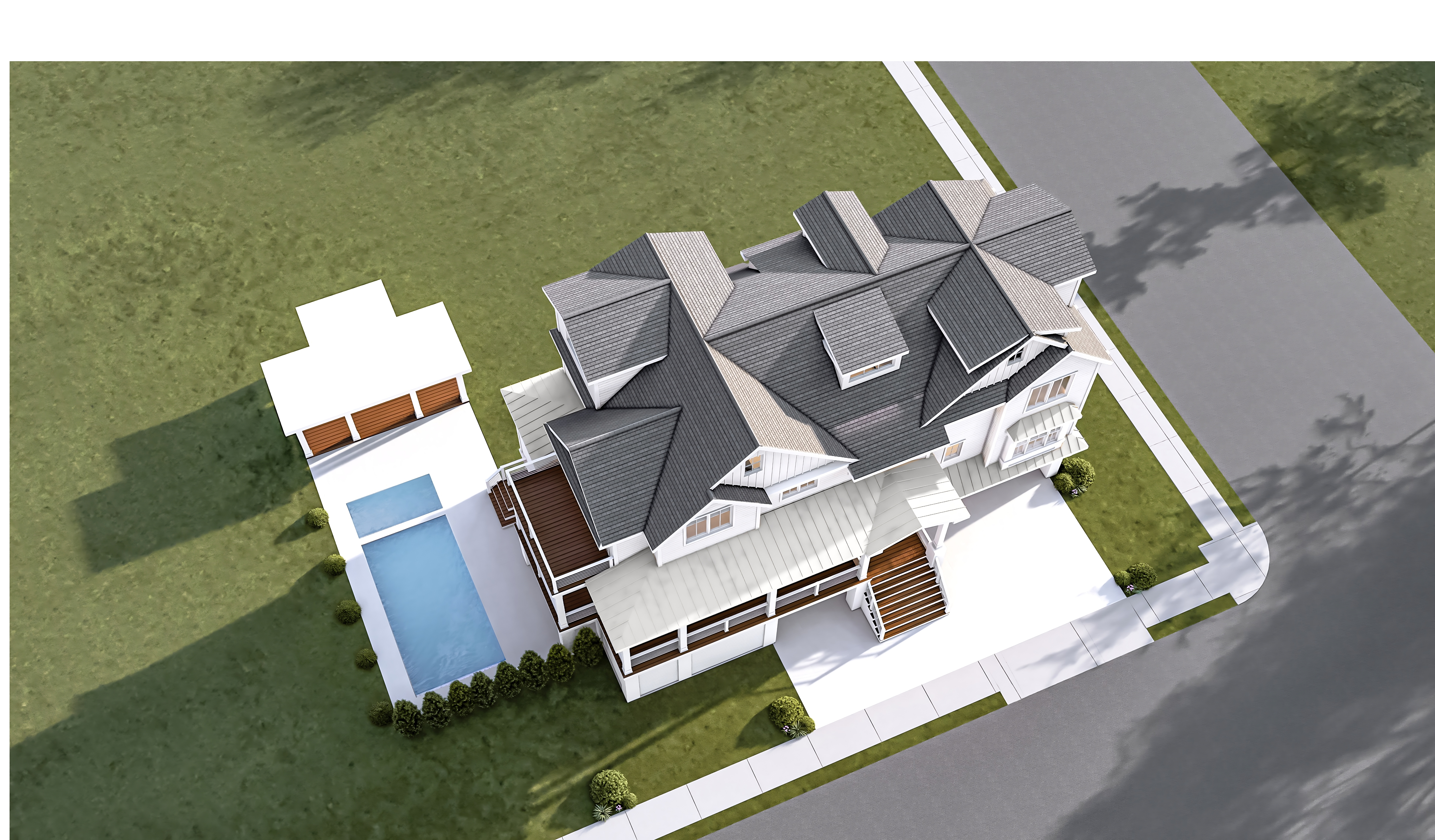 create a luxurious aerial view of an elegant suburban house with a light gray roof and white walls the house features multiple gables and a spacious wooden porch in a rich brown hue include a swimming pool with clear blue water surrounded by vibrant green grass and neatly aligned shrubs the driveway and surrounding road should be a smooth gray with a clear pathway leading to the house the atmosphere is serene and sunny casting gentle shadows for a warm and inviting feel architecture