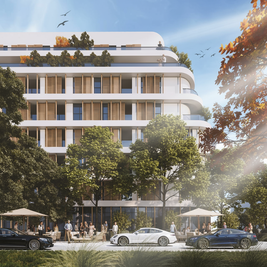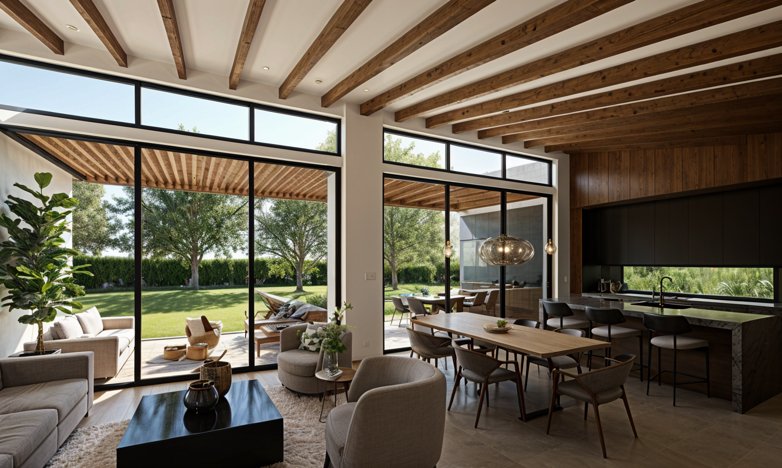 create and interior view of this floor plan ceilings are 12 high wall and ceilings are white floor is medium brown plank floor running right to left use light blue cabinets with white marble countertops add wine bottles and glasses to countertop use a large mirror behind the open shelves