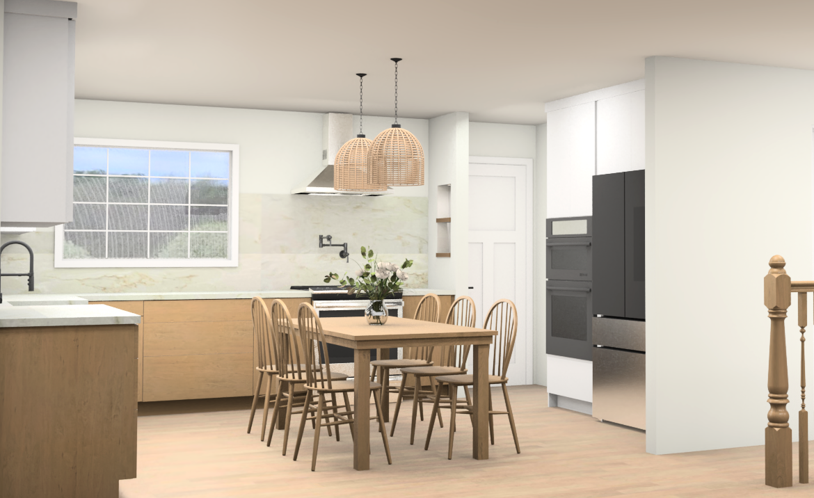 add recessed lights to the ceiling change the view from the window to more green nature and the glass to be cleaner change the shade of the backsplash to a lighter one the walls are white
