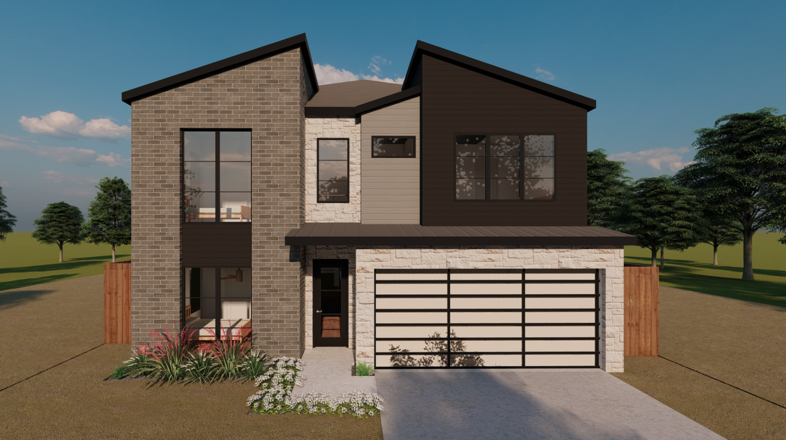 mid day lighting a clear rendering that pops on the accents and makes it look like a real house