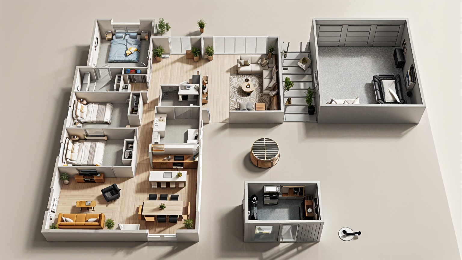 convert this floor plan into a realistic isometric 3d view of a full house show the space from an elevated angle with furniture walls and details visible dont take liberties maintain wall structure correct windows and internals clean minimalistic furniture scandanavian style use the same furniture as shows on the plan do not change the orientation of the floorplan