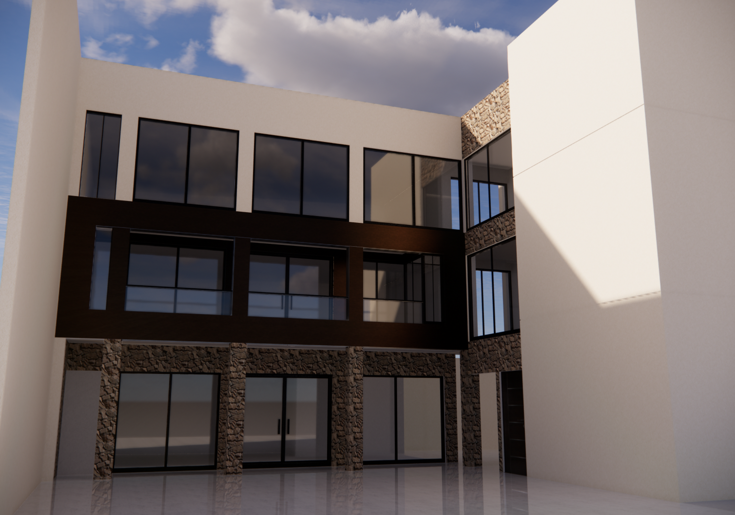 preserve exactly the existing building geometry structure proportions volumes openings and layout do not alter the design apply highly realistic physically based materials natural irregular stone cladding on the laboratory volume with subtle color variation light beige sand soft gray non repeating pattern softened joints matte sealed finish smooth stucco plaster walls with fine texture and natural imperfections dark wood or metal cladding with realistic grain and roughness ultra realistic glass with accurate reflections of sky and surroundings proper transparency interior depth and slight reflectivity variation add natural realistic vegetation healthy green plants with varied species natural leaf translucency correct scale subtle shadow casting use clear blue sky soft natural daylight realistic sun angle balanced exposure global illumination soft shadows professional architectural photography style neutral color grading high realism 4k detail