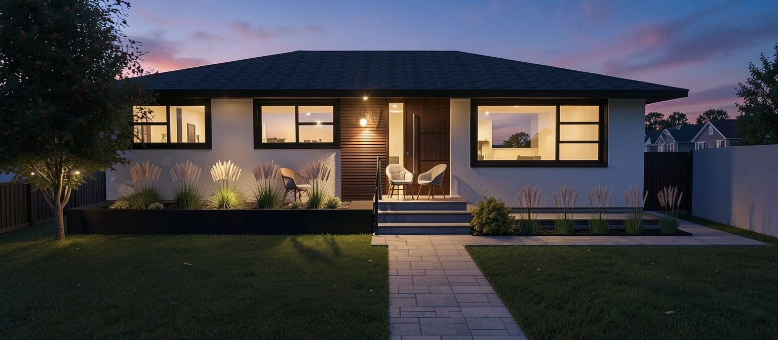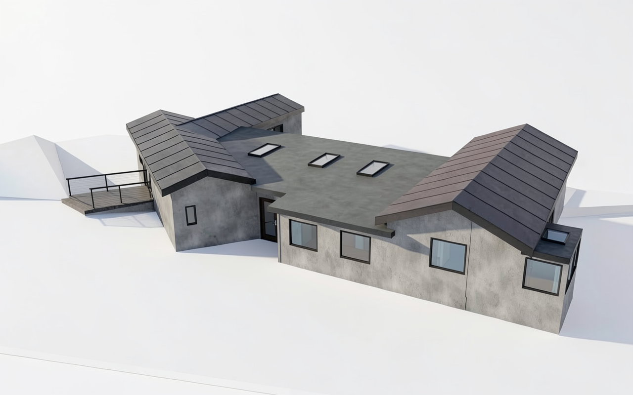 photorealistic interior high resolution polished white tile floors white walls with orange text left wall is wood slats that wraps up onto the ceiling boxes floating in the ceiling in the middle are soft dim light warm soft glowing there s wood accents on the middle tower the space is lit up with soft ceiling soft lights bright lighting and overall environment is soft warm bright lighting on the right light beige paint panels desk is grey top with orange corrugated metal panel at the bottom on the left view behind back glass is parking lot with trees do not add windows