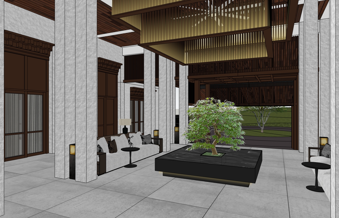 the columns and walls in rough plaster and white paint finish in matt