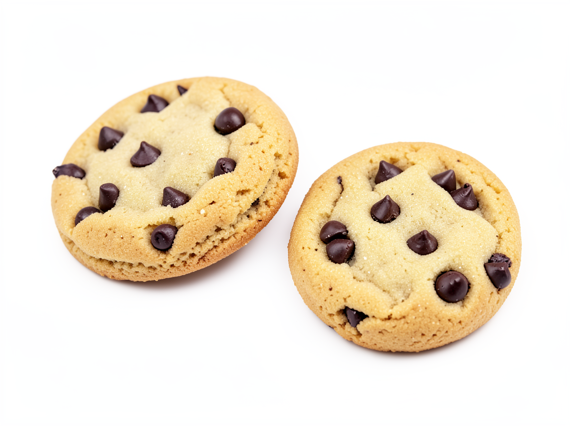 make a pure white background only show one cookies and remove the grill change to a sugar cookie do two do chocolate chips instead of berries do three with less chocolate chips no bites and a brown table