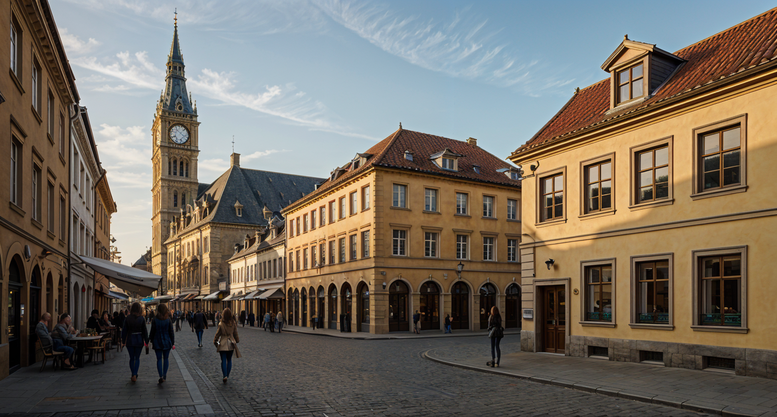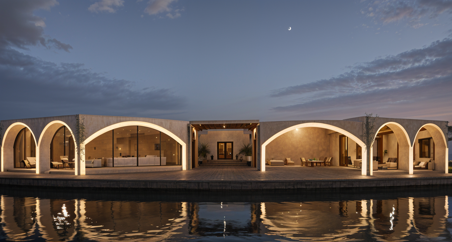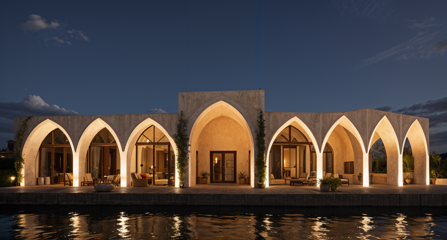 exterior shot semi circular arches of a modern architectural structure with a contemporary design set against a clear blue sky the building features soft beige walls with large glass windows reflecting the sunlight the foreground displays a patterned terracotta tile floor in the background fluffy pink and orange clouds float gently in the crisp blue sky creating a serene and peaceful atmosphere the scene is bathed in warm sunlight casting soft shadows and enhancing the tranquil ambiance