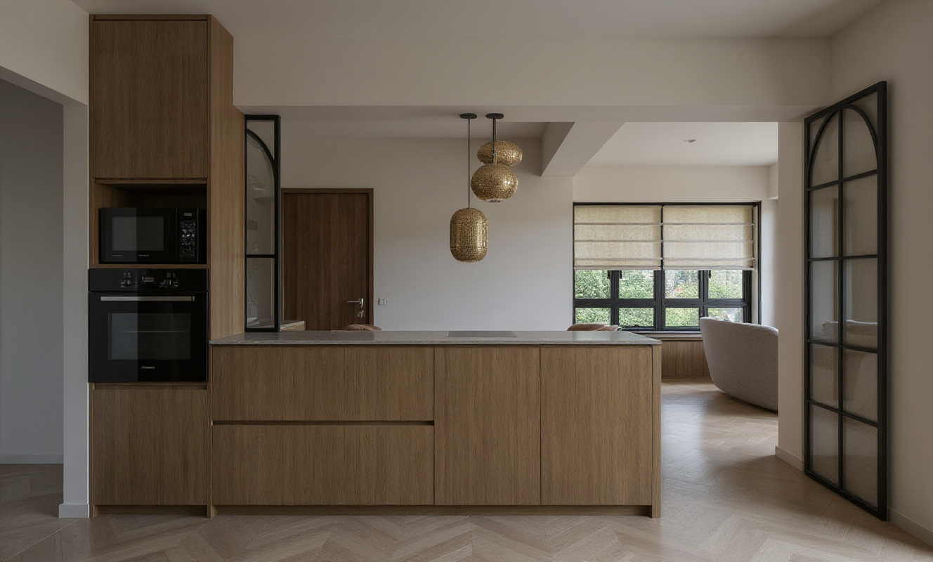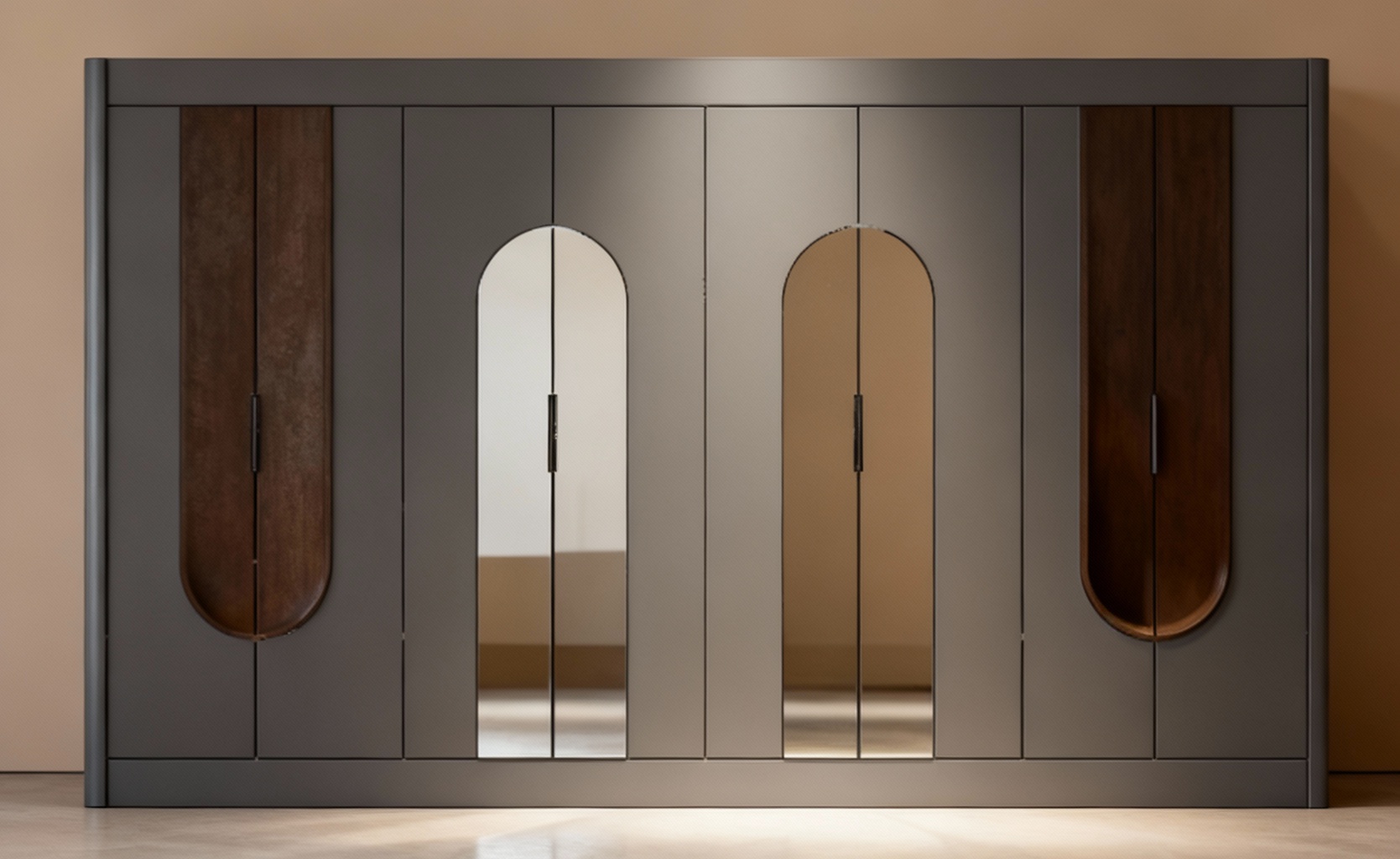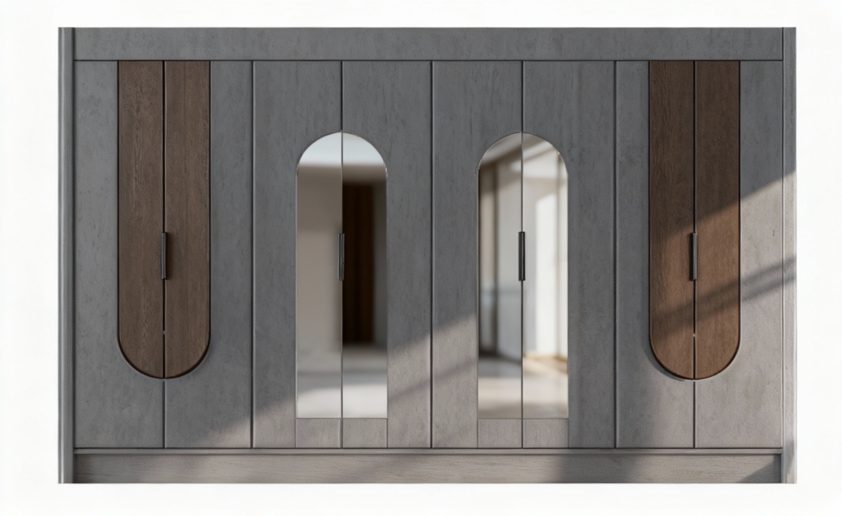 exterior shot semi circular arches of a modern architectural structure with a contemporary design set against a clear blue sky the building features soft beige walls with large glass windows reflecting the sunlight the foreground displays a patterned terracotta tile floor in the background fluffy pink and orange clouds float gently in the crisp blue sky creating a serene and peaceful atmosphere the scene is bathed in warm sunlight casting soft shadows and enhancing the tranquil ambiance