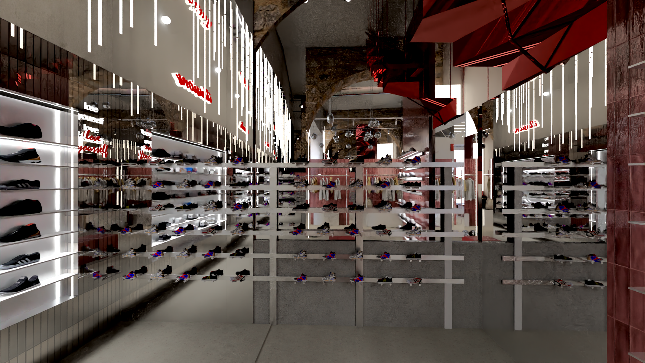 a hyper realistic interior image a sports shoes shop add artificial lighting near the shelf