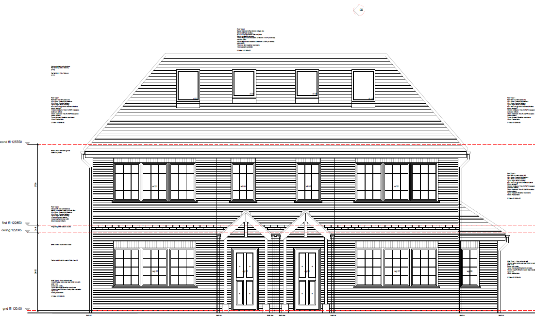 red multi stock brickwork laid stretcher bond open side timber framed porch with pitched gable roof timbers painted in white to match windows white painted upvc casement windows with astragal bars black front doors clay roof tiles in a warm red brown tone laid flat roof lights only no dormers soft natural daylight with realistic shadows follow the drawing exactly ultra realistic textures architectural photography style remove all text from image sunny background simple white floral landscaping under windows small grass area with gravel paths up to front doors prominent bonnet hip tiles along roof hips