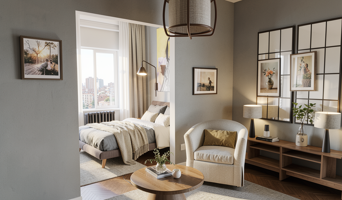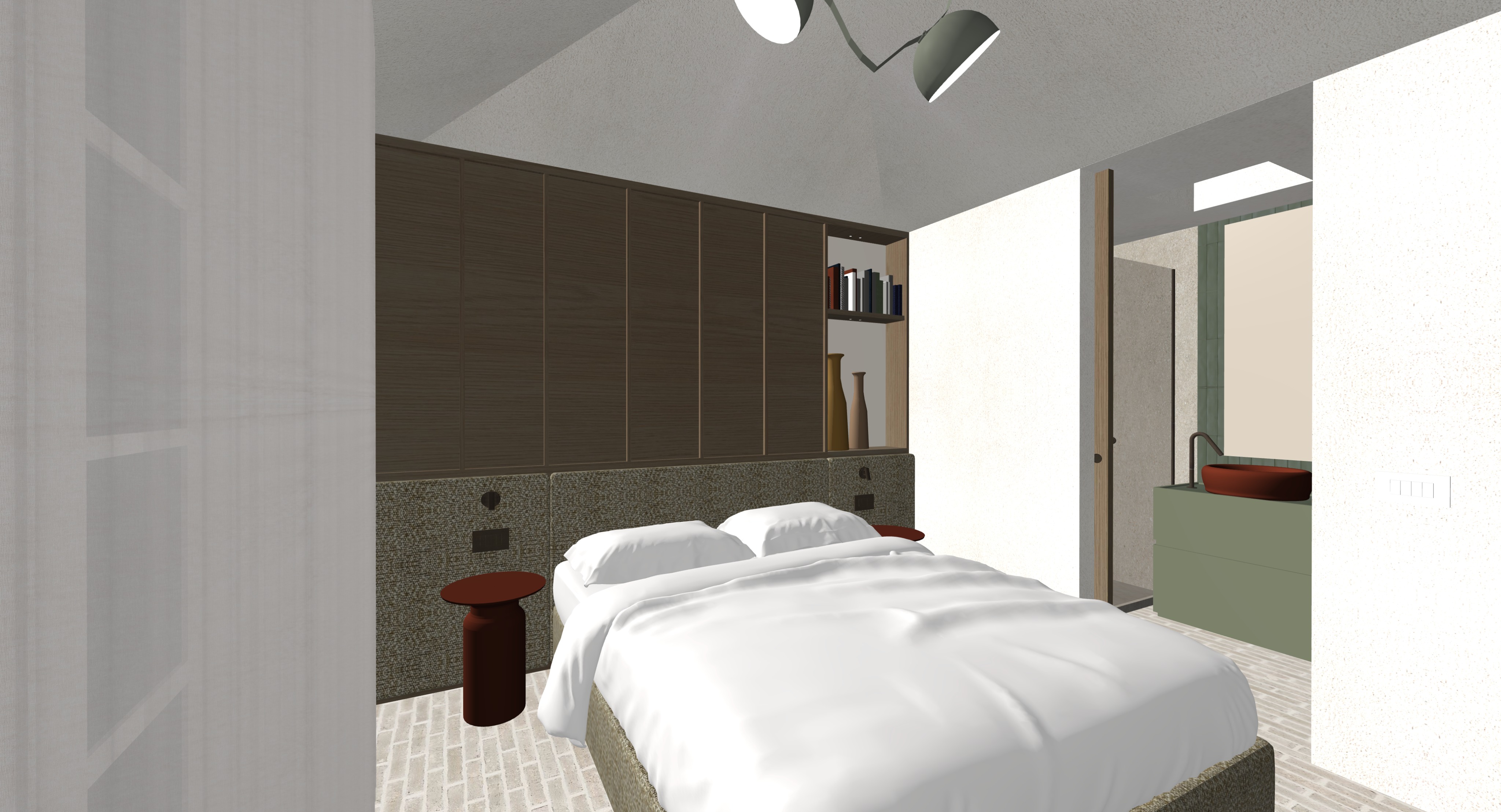 le pareti sono intonacate bianco caldo intonaco con texture come muri esterni mantieni tessuto testata letto specchio dietro nicchia libri e vasi comodini laccati lucidi rosso ruggine scuro luci lettura con finitura metallo marrone accendi micro faretti dentro nicchie ceramica lavabo rosso ruggine scura lucida legno rovere come texture immagine leggermente spazzolato