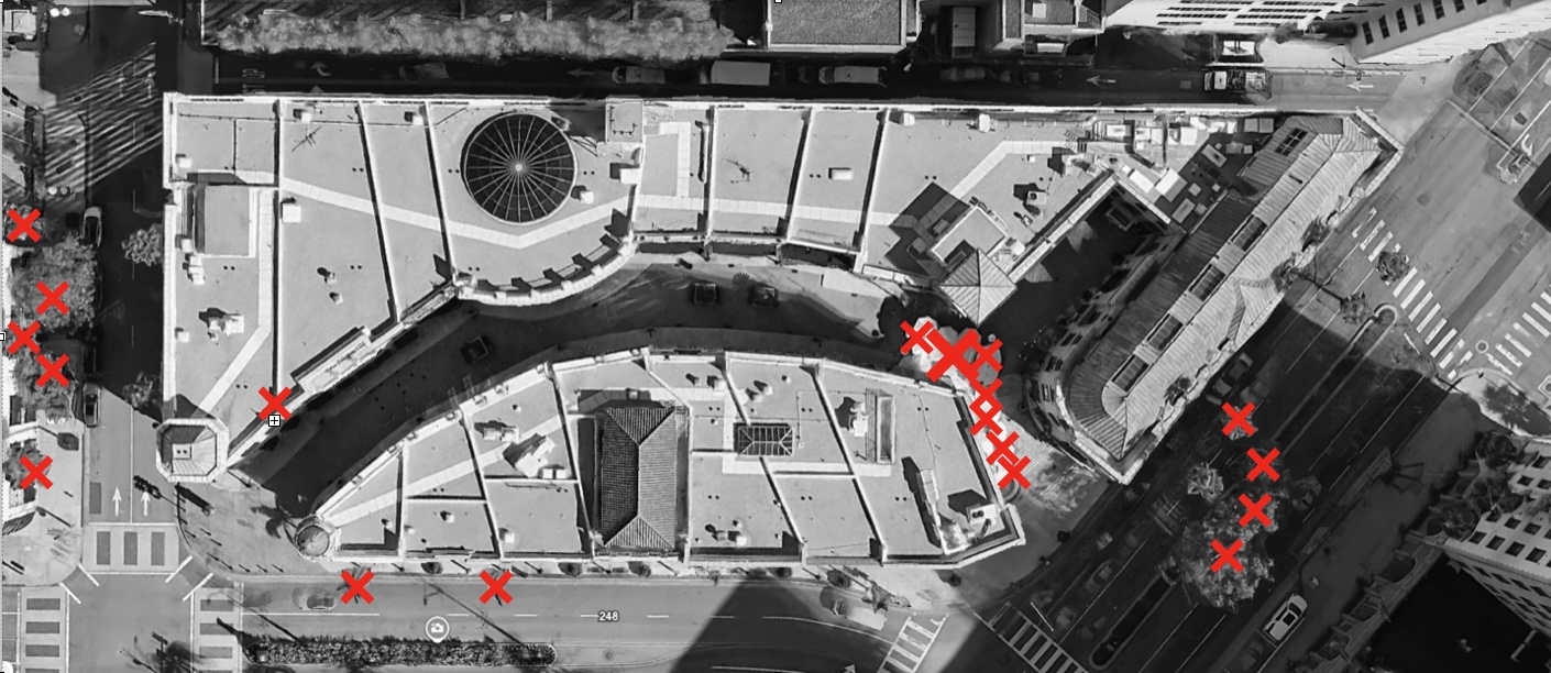clean up this image remove all trees that have a red x all sun umbrellas that have a red x