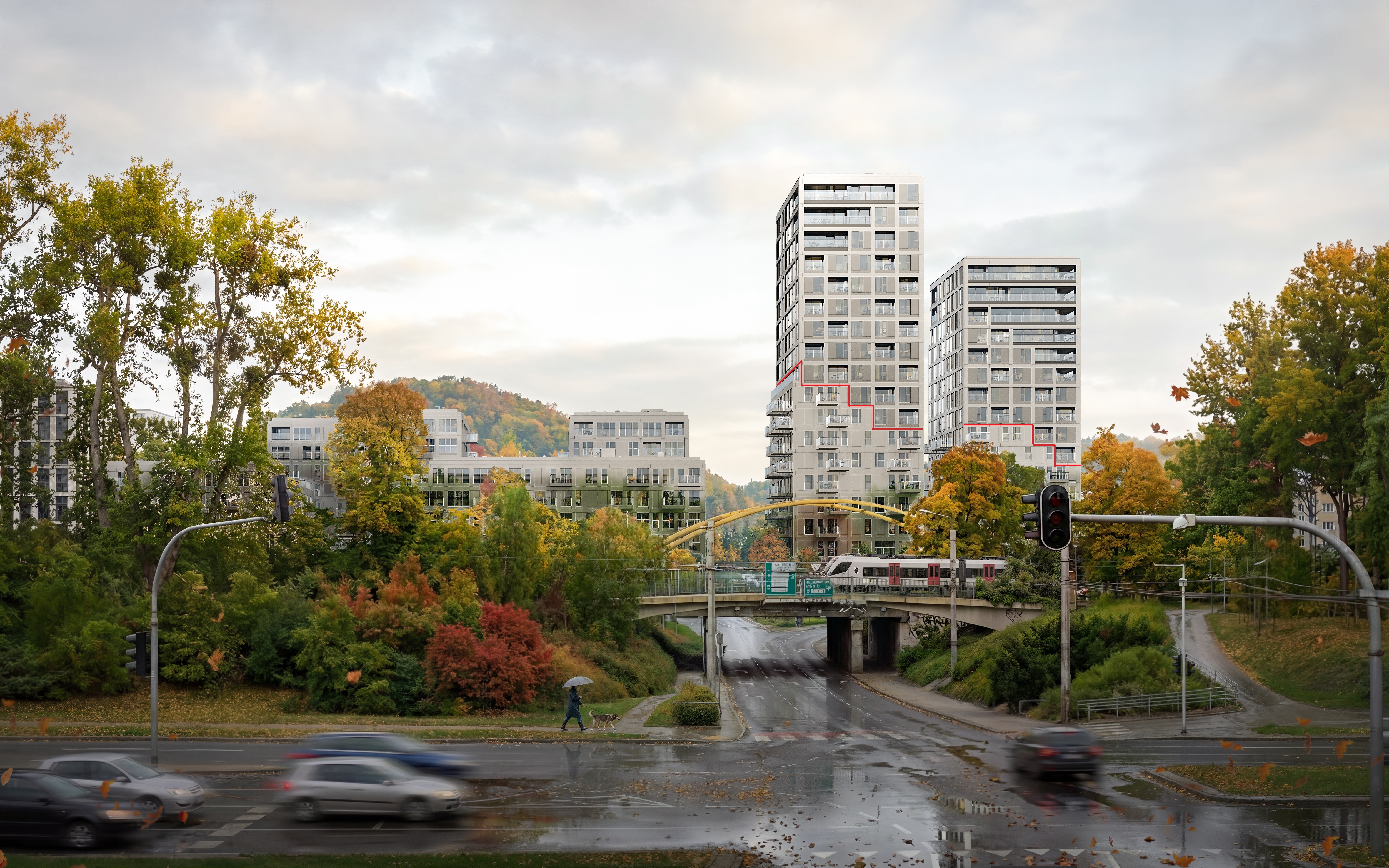 make red light same colour as elevation i want to change the top layer of elevation in both highest building for 70 reflective less then a mirror bottom layer of elevation very light grey change the weather for sunny summer green trees