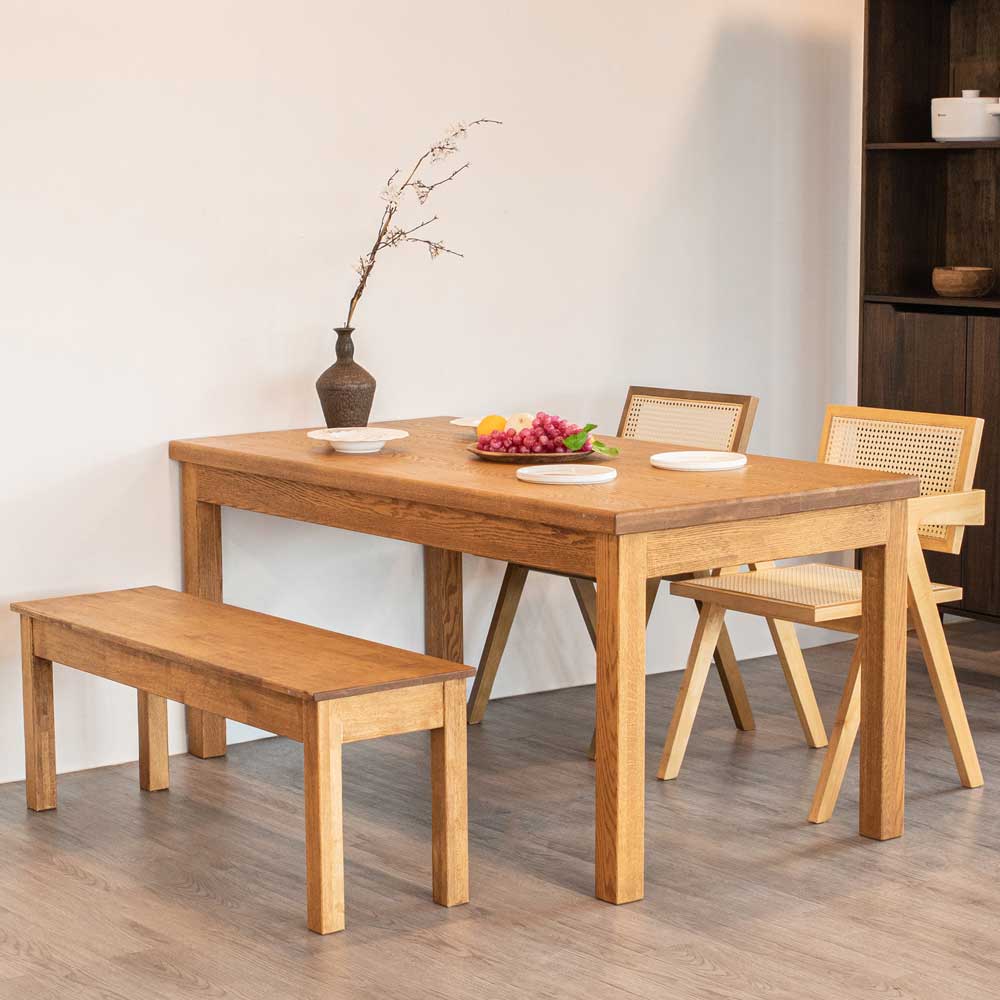 change the background to a stylish modern dining interior that complements the natural solid wood table bench and chairs use warm neutral tones such as light beige or soft grey walls and light wood or matte cement flooring for a clean contemporary feel introduce gentle daylight from a nearby window to create soft realistic shadows that highlight the furniture s wood texture you may add a few elegant decorations beside or behind the dining area for example a tall indoor plant in a minimalist ceramic pot a framed wall art piece or a simple pendant light above the table to enhance the overall atmosphere do not alter the design color or angle of the dining table and chairs maintain realistic lighting proportions and shadow consistency