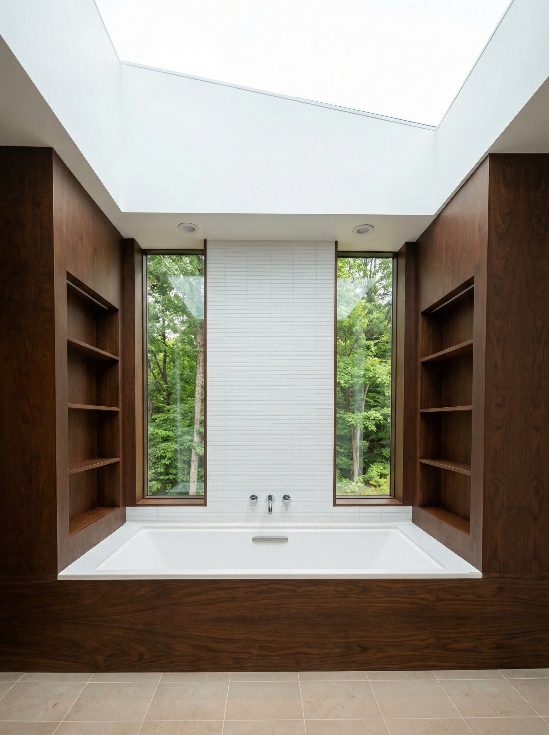 modernist interior shot and some warmth and shadows and remove the wall mounted handles leave the faucet where it is put the handles on the tile sill to the left of the tub architecture