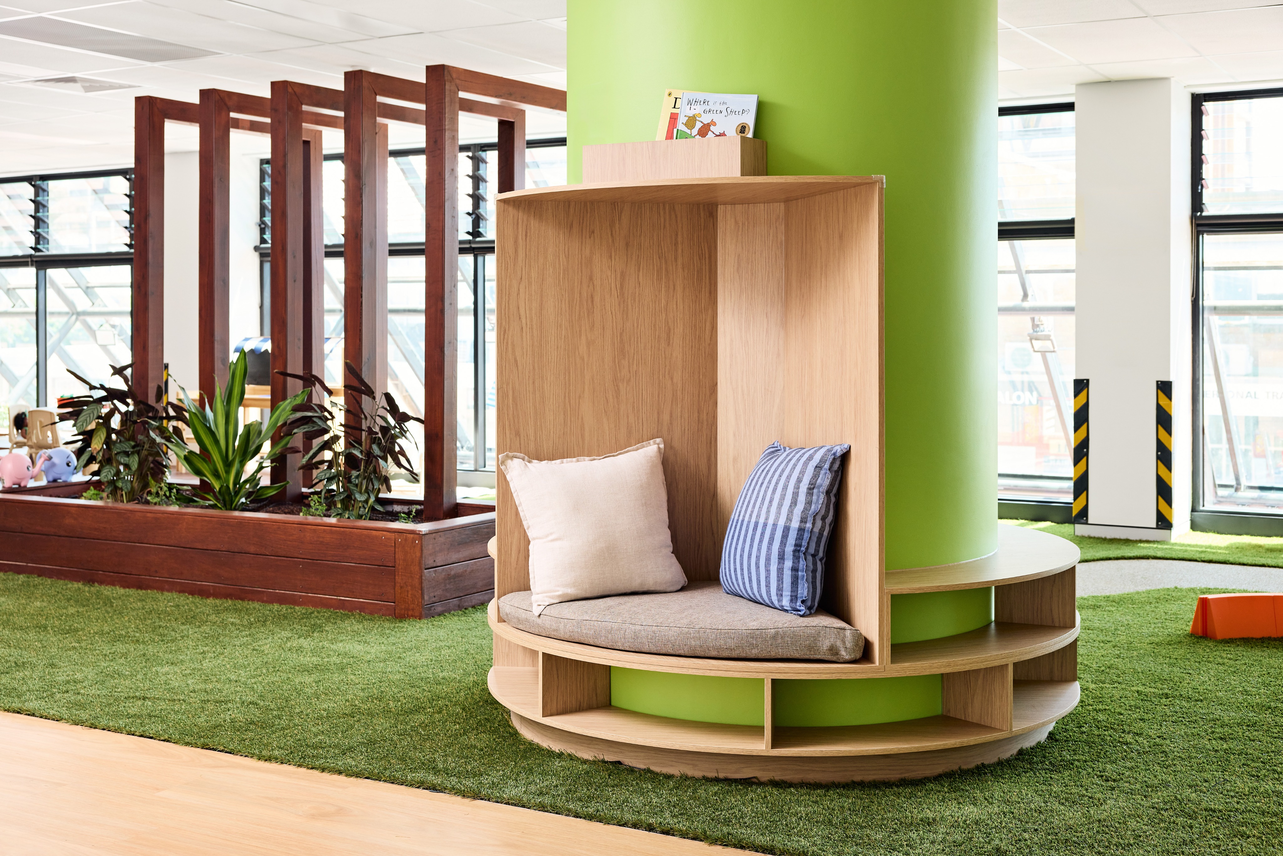 keep the artificial grass make this interior of a childcare centre more skandi and add 2 children playing