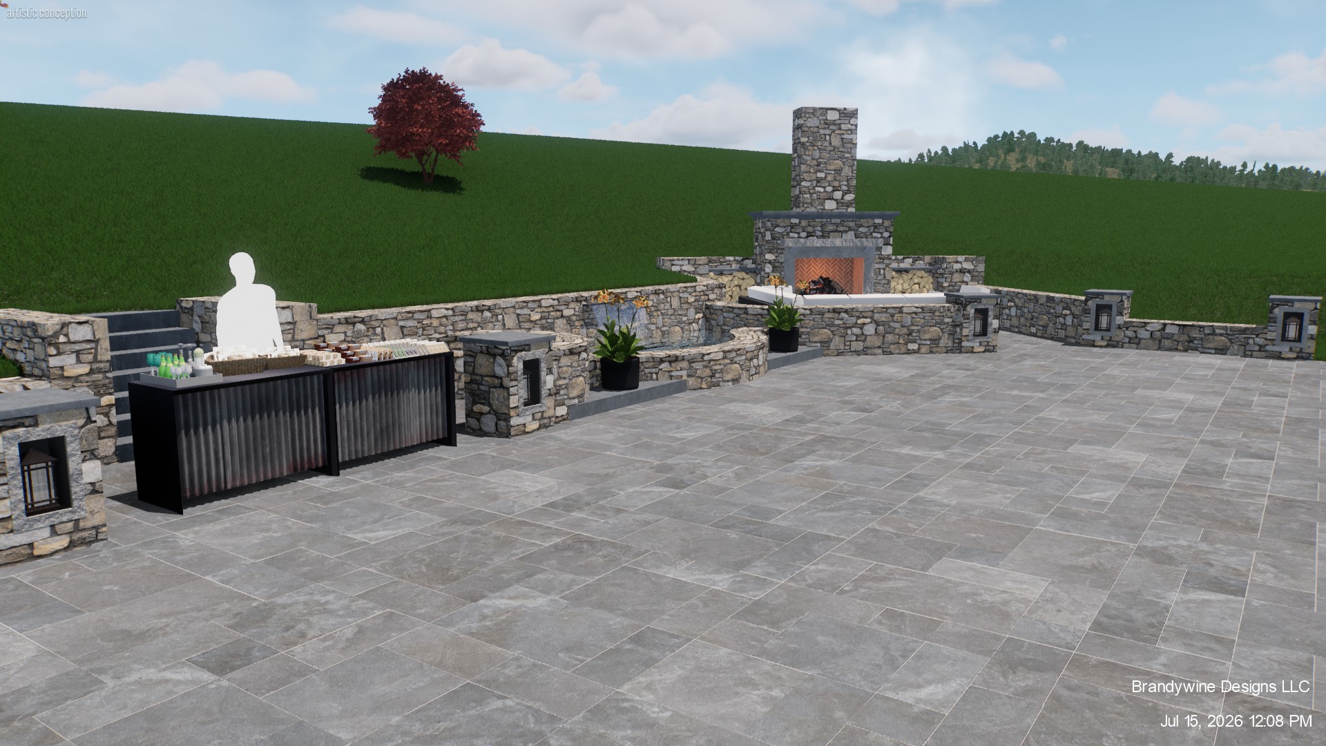 create a beautifully rendered outdoor patio scene the stone flooring is textured with shades of natural grey the stone walls and fireplace are crafted with mixed stone in soft beige and light grey tones add lots of natural light creating a bright and inviting atmosphere surrounding grass hills are lush green with a single vibrant red tree adding contrast include potted plants on the patio with lush green foliage and delicate yellow blooms the sky is a clear blue with soft fluffy white clouds invoking a serene and peaceful outdoor ambiance architecture
