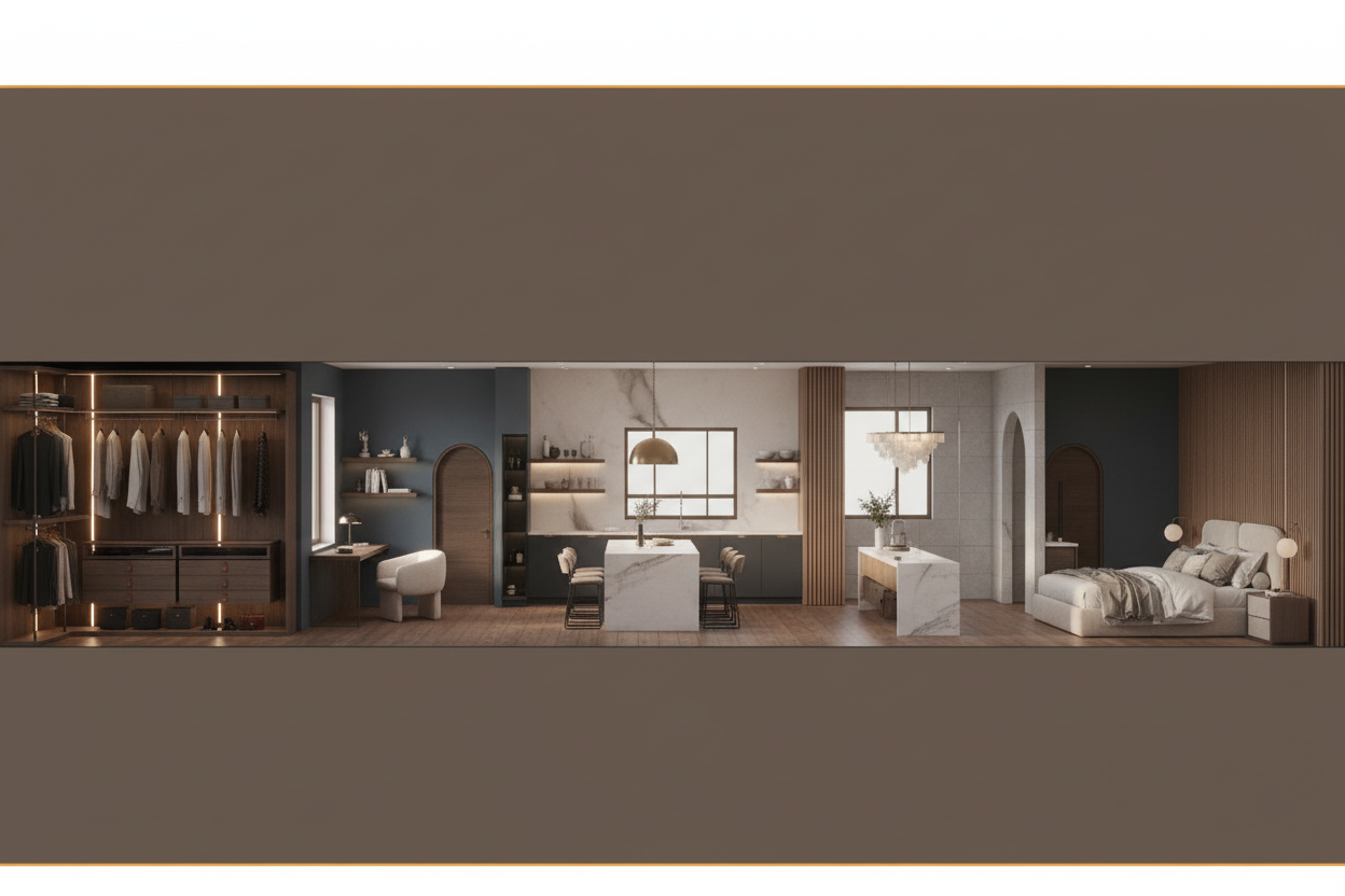 show as an accurate elevation a high end architectural interior visualization of a luxury suite architectural digest style the scene transitions from a sophisticated custom walk in closet with integrated led lighting and dark wood shelving to a serene home office with a slate blue accent wall and arched wooden door the kitchen area features a marble backsplash with floating shelves and a brass dome pendant in the bedroom a minimalist floor to ceiling wooden wardrobe is paired with soft plush bedding design elements include vertical wood slatting organic arched portals and a neutral warm toned color palette with deep charcoal accents soft natural morning light photo realistic 8k resolution cinematic atmosphere tactile textures of boucl wood grain and polished stone