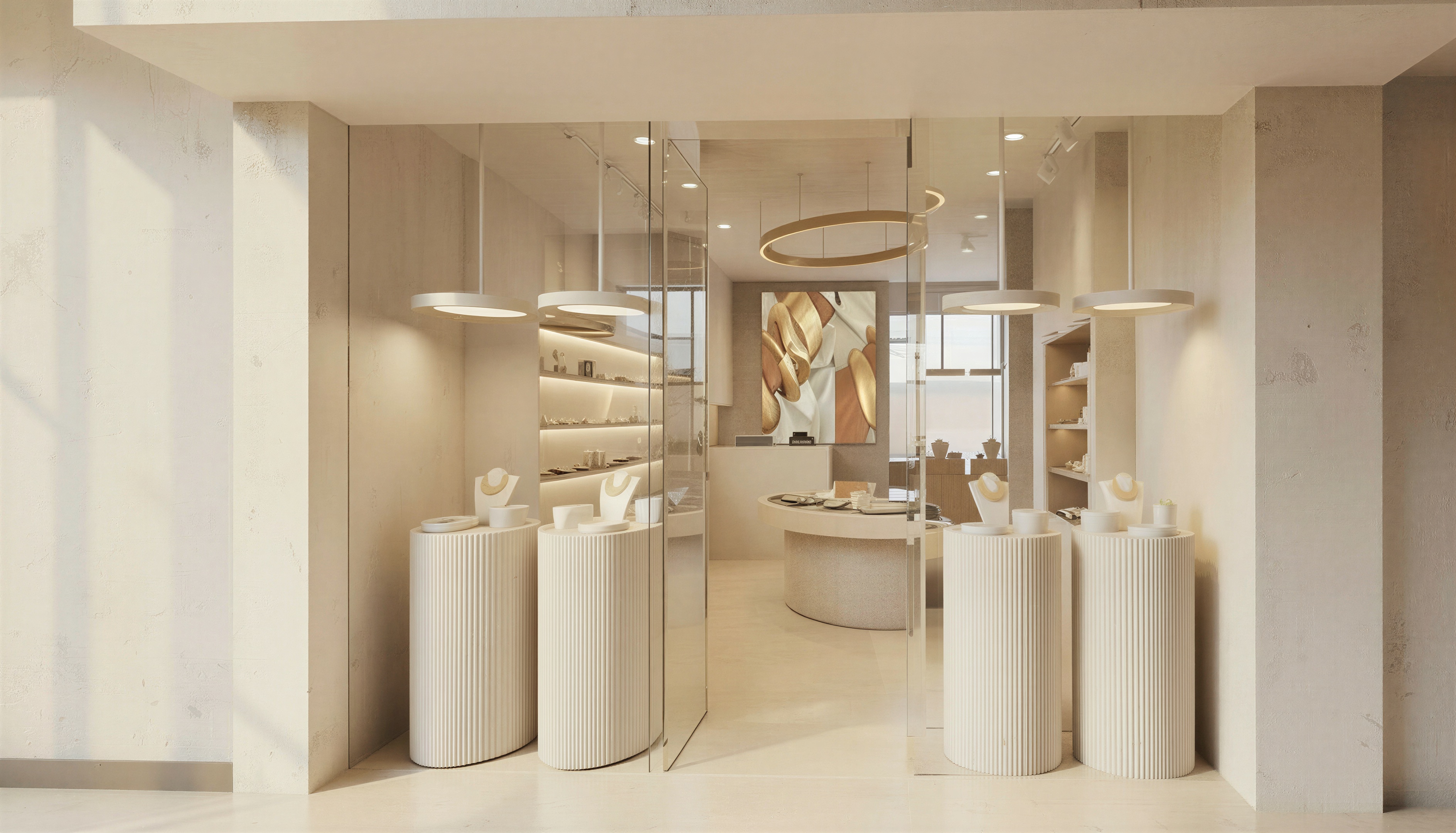 upscale the interior lighting all walls and floor is light beige stucco warm light