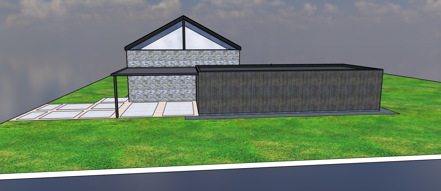 modernist exterior shot render a modern house with a sleek contemporary design the house features two sections one with a triangular roof and one with a flat roof use realistic gray stone textures for the walls of the triangular roof section and dark wood paneling for the flat roofed section the roof is a pitch black modern design the windows are large with clear glass allowing light to stream in the pavement is made of light gray concrete slabs the grass surrounding the house is vibrant green with a well maintained lawn the atmosphere is a serene partly cloudy day with soft natural lighting enhancing the modern and minimalist feel of the scene architecture