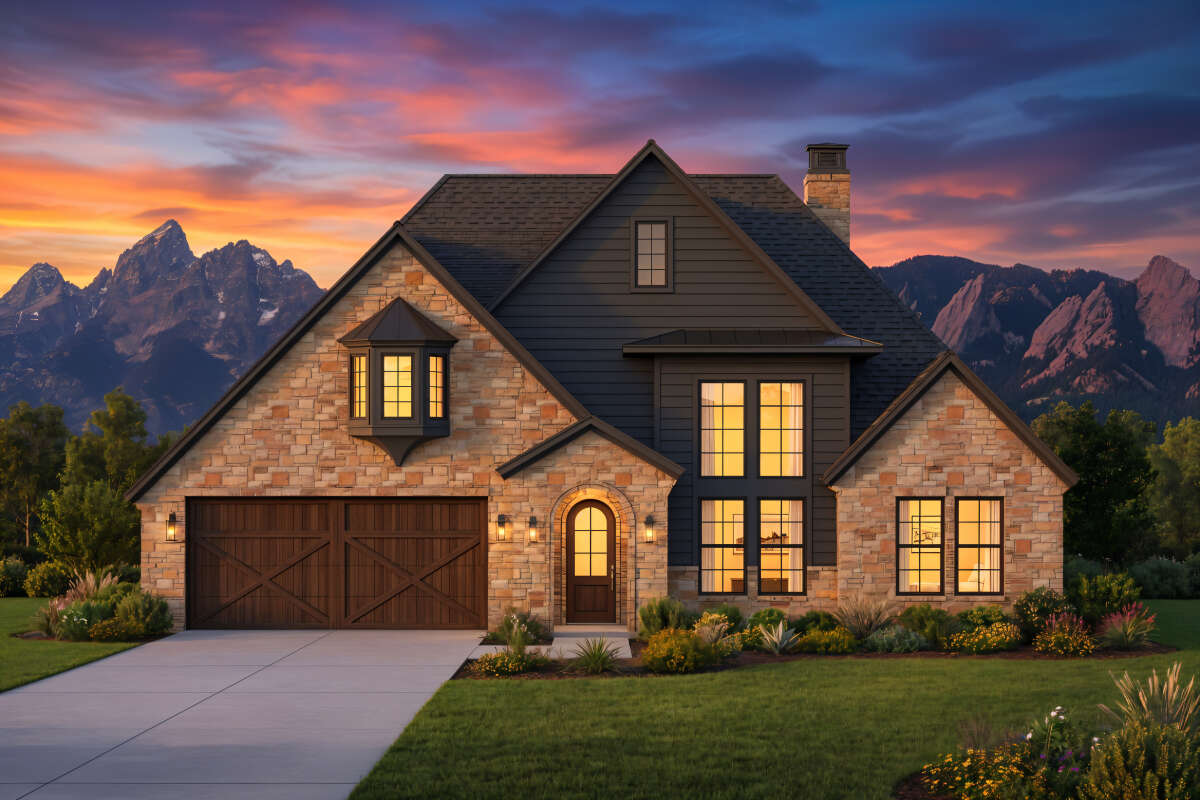 a beautiful suburban home at sunset featuring a cozy stone facade with warm brown and beige tones the roof is a deep slate gray complementing the wooden garage doors in rich mahogany the windows glow with a soft golden light creating a welcoming atmosphere surrounding the house a lush green lawn is complemented by colorful garden plants and shrubs in shades of dark green yellow and purple in the background majestic mountains are painted in deep blues and purples as the sky transitions from vibrant orange to a calming pastel shade the scene is serene and inviting remove the lanterns on the front of the house