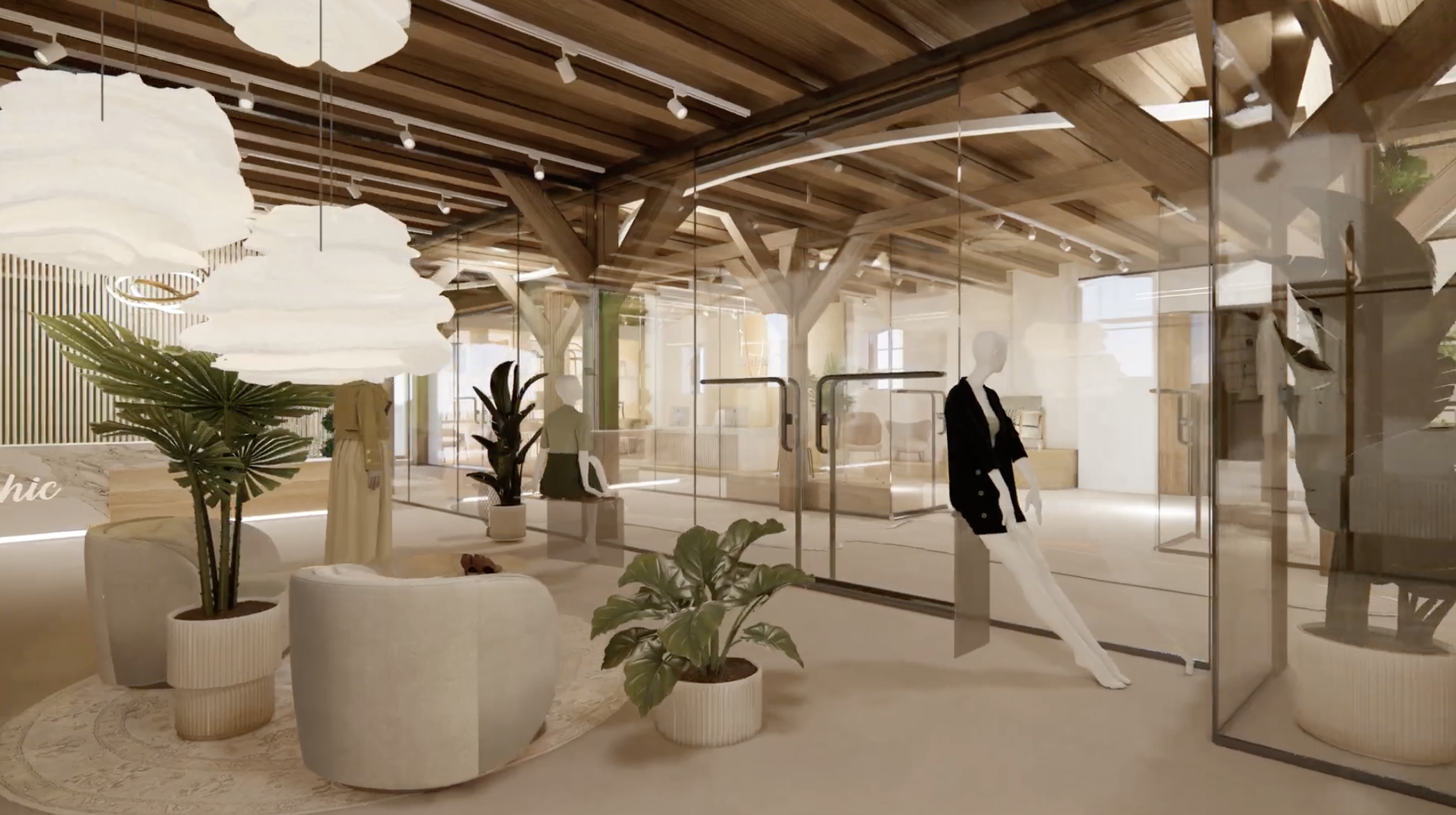 urob z tejto vizualizacie fotku uprav textury svetlo materialy aby to vyzeralo ako fotografia toho priestoru podlaha ostava svetly vinyl ako na obrazku zmen cely priestor na predajnu kabeliek zrus co je teraz v priestore a preidaj tam stojany regaly s roznymi farebnymi kabelkami