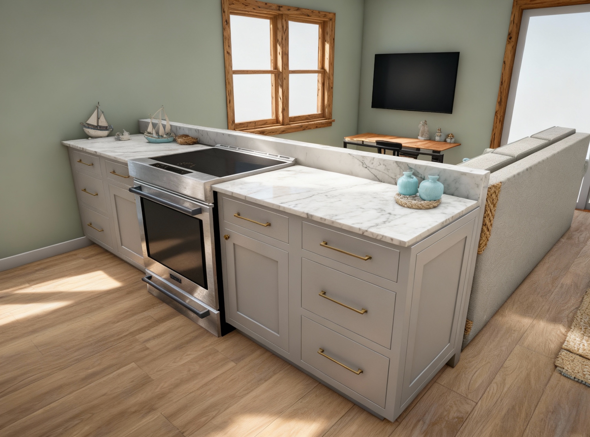 add realistic textures bright lighting staging trees view throught the window and lake view through the door