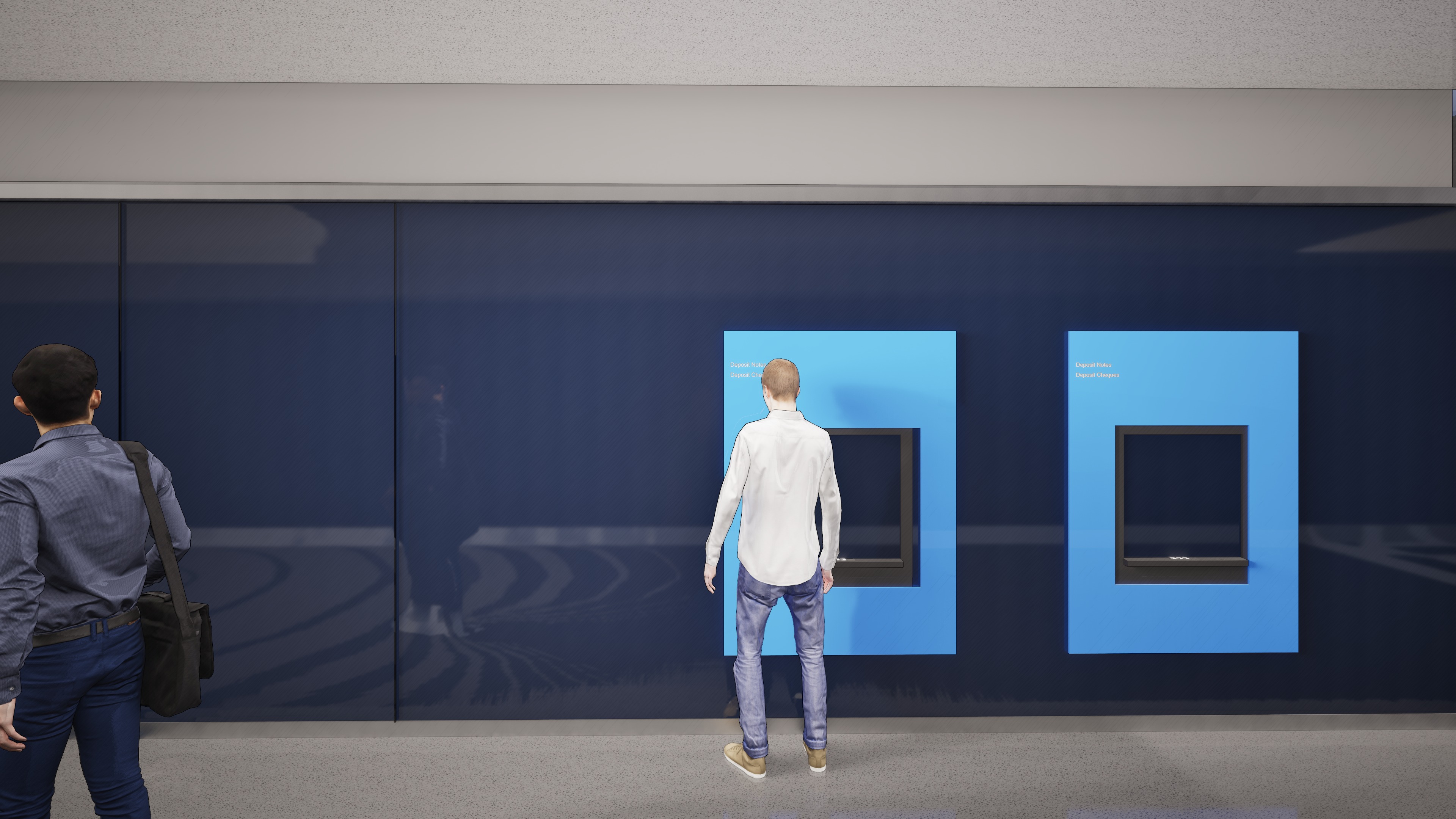 dark blue glass wall with 2 atm machines and a dull subtle reflection on the glass of the adjacent carpark located inside a shopping mall corridor grey concrete floor and ceiling
