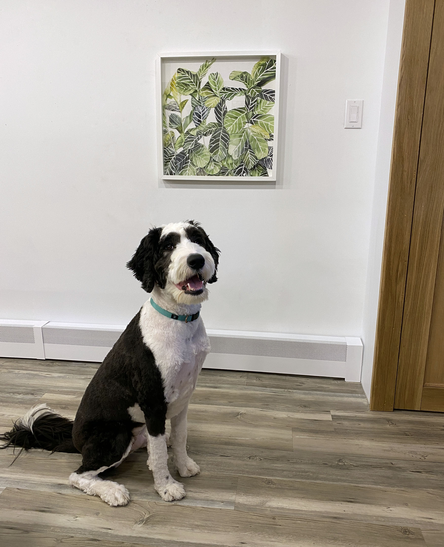 using these two reference images add the black and white bernedoodle dog wearing a teal collar from the first photo into the elegant home entryway scene in the second photo place the dog sitting upright on the persian rug in the center of the room facing the camera with its mouth open and happy expression exactly as it appears in the reference photo the white perforated baseboard heater cover along the back wall must remain completely visible and unobstructed it is the hero product of this image keep the dog proportionally sized to the room carefully match the dog s lighting and shadows to the warm interior lighting of the entryway scene do not alter any other elements of the room the final result should look like a professional lifestyle product photograph