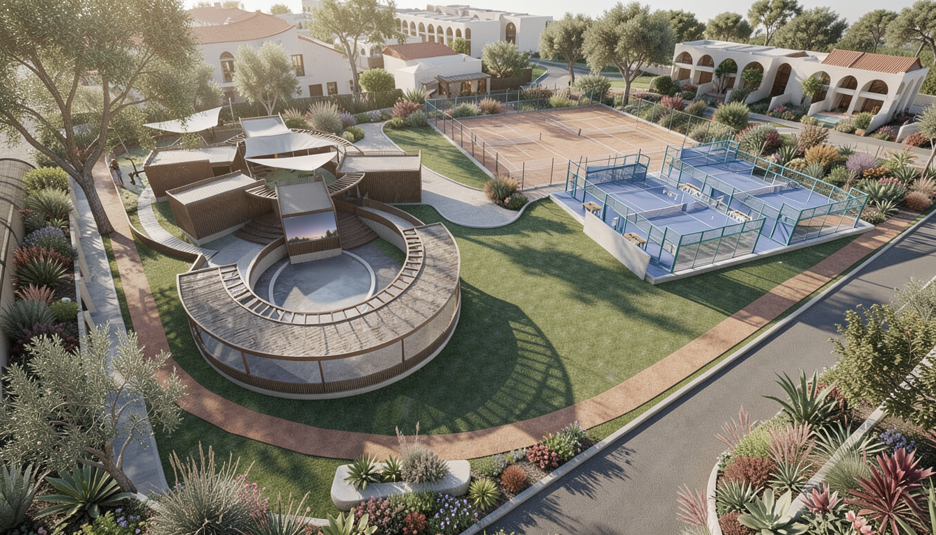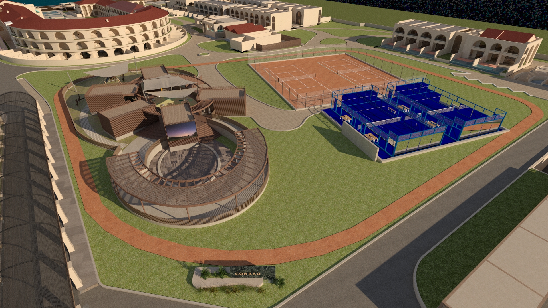 extra realistic view add mediteranean trees and plants out of the tartan area tennis padels warm color light