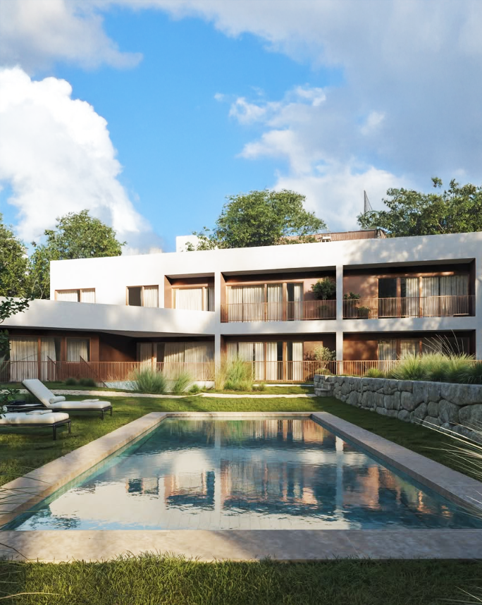 generate a photorealistic architectural animation introduce soft procedural water ripples in the swimming pool with realistic light reflections and subtle refraction animate tree leaves and garden plants with gentle wind motion very low intensity apply a slow smooth dolly in camera movement with cinematic stabilization and shallow parallax effect keep the building geometry perfectly stable and unchanged preserve global illumination natural daylight soft shadows and high end archviz rendering quality the movement should feel minimal refined and atmospheric