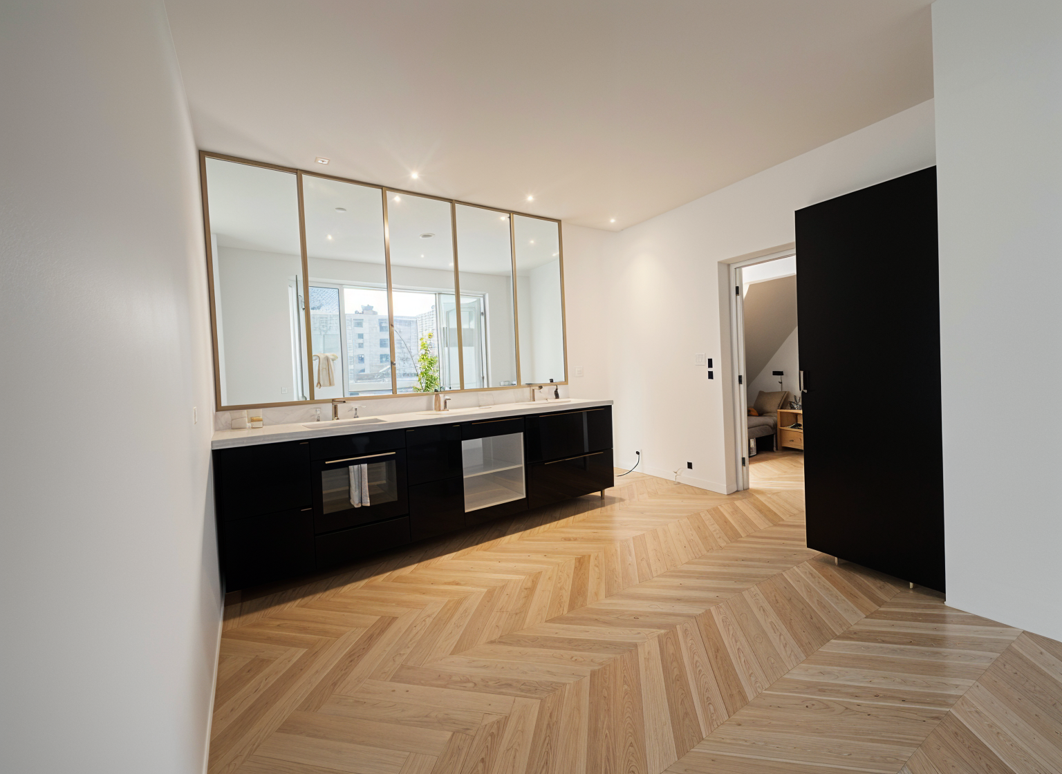 add a glass partition wall with wood frames x3 above the small kitchen backsplash wooden door on the right following the glass light mat beige oak wood flooring installed in a herringbone pattern architecture