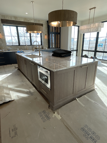 do not change the cabinets in any way preserve the exact cabinet colors materials finishes dimensions door and drawer styles hardware spacing alignment and all geometry exactly as shown do not alter the countertop shape backsplash appliances flooring lighting fixtures or wall structure only remove the construction materials clutter and mess from the scene clean the room and make it look finished and staged add a few simple tasteful home accessories appropriate for the style of the space but do not add or remove any furniture windows or architectural elements maintain the original lighting direction and realism enhance clarity and polish the photo while keeping the cabinetry and room design completely unchanged do not alter the lighting to keep the cabinet colors as they are in the image add new flooring turn the lights on add views out of all the windows put a dining table under the glass chandelier stage the countertop for a kitchen