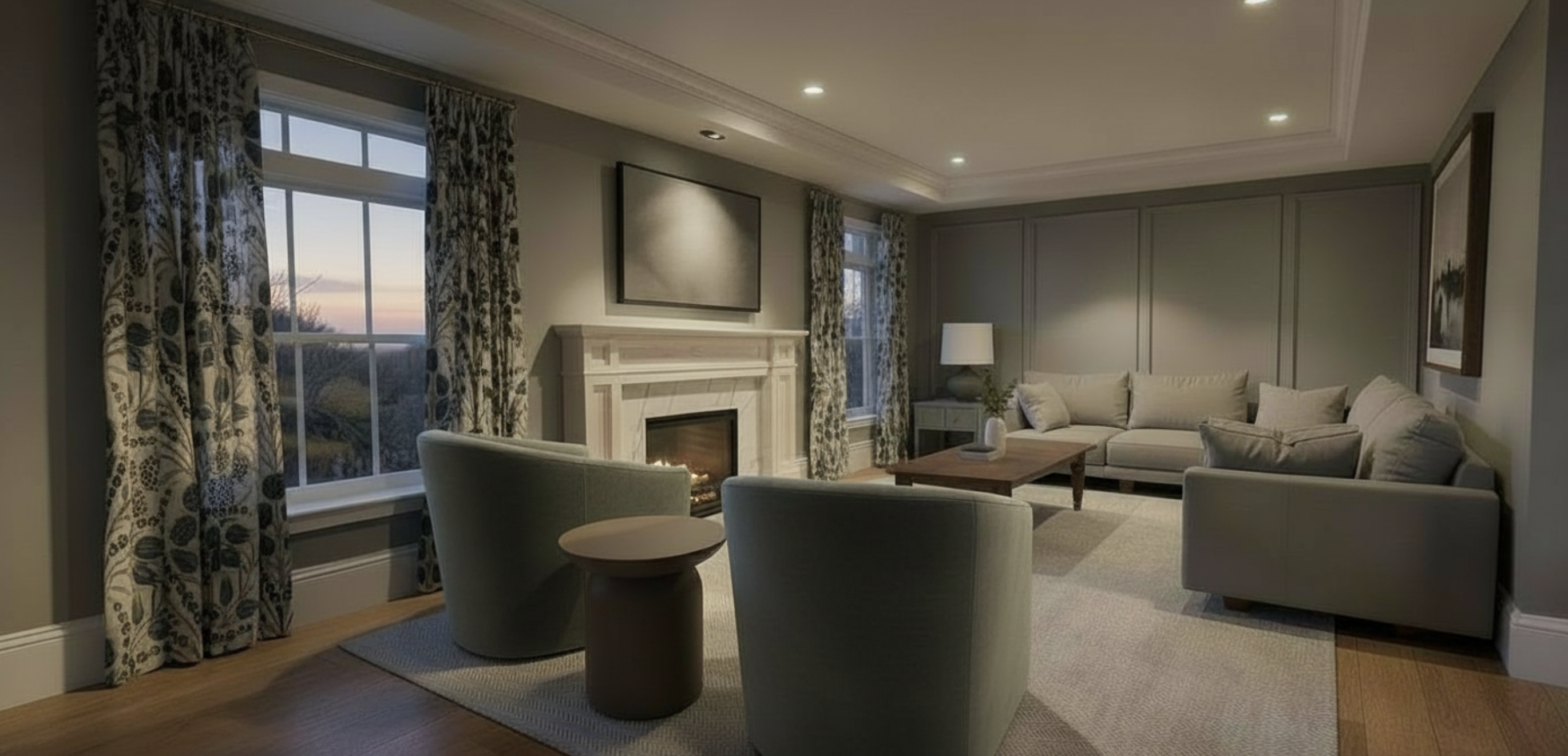 show me the room rendering above with the table and coach style and color from this reference images added below