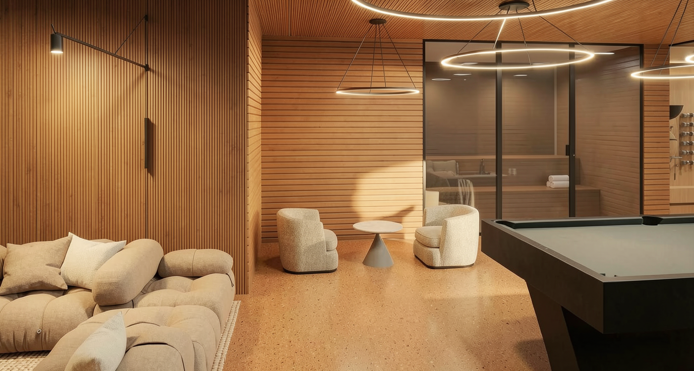 render a photorealistic lower level den area with warm atmosphere walls and ceiling are a slat cedar flooring is a cork sofa is a soft beige fabric with complementing pillows two lounge chairs by a black pool table in a textured light beige fabric with a ceramic table in center that has a greyish base