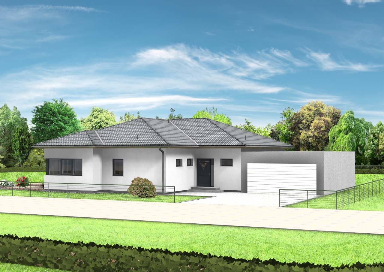 photorealistic architectural visualization of a modern single story bungalow with an integrated garage the bungalow is located on a clearly defined plot of land along the entire property boundary a fence is visible clearly marking the lot line the fence matches the reference image exactly in terms of material color and style and blends harmoniously into the overall design all colors materials and finishes of the house including fa ade roof garage door and architectural details are taken directly from the provided reference image and must be reproduced accurately realistic materials such as plaster wood metal and glass natural lighting conditions soft realistic shadows and accurate reflections well maintained landscaping with grass subtle plants and a paved driveway leading to the garage eye level perspective with a slight wide angle view clean architectural lines modern design high level of detail ultra realistic 8k resolution architectural visualization archviz global illumination depth of field realistic textures natural color balance professional real estate rendering