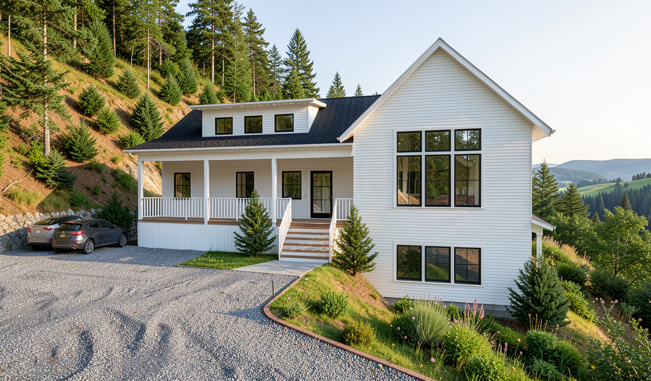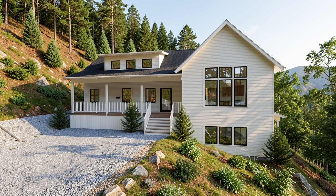 show this in arctic white hardie board board and batten with stone on the left side of the house and cedar style front door and garage door