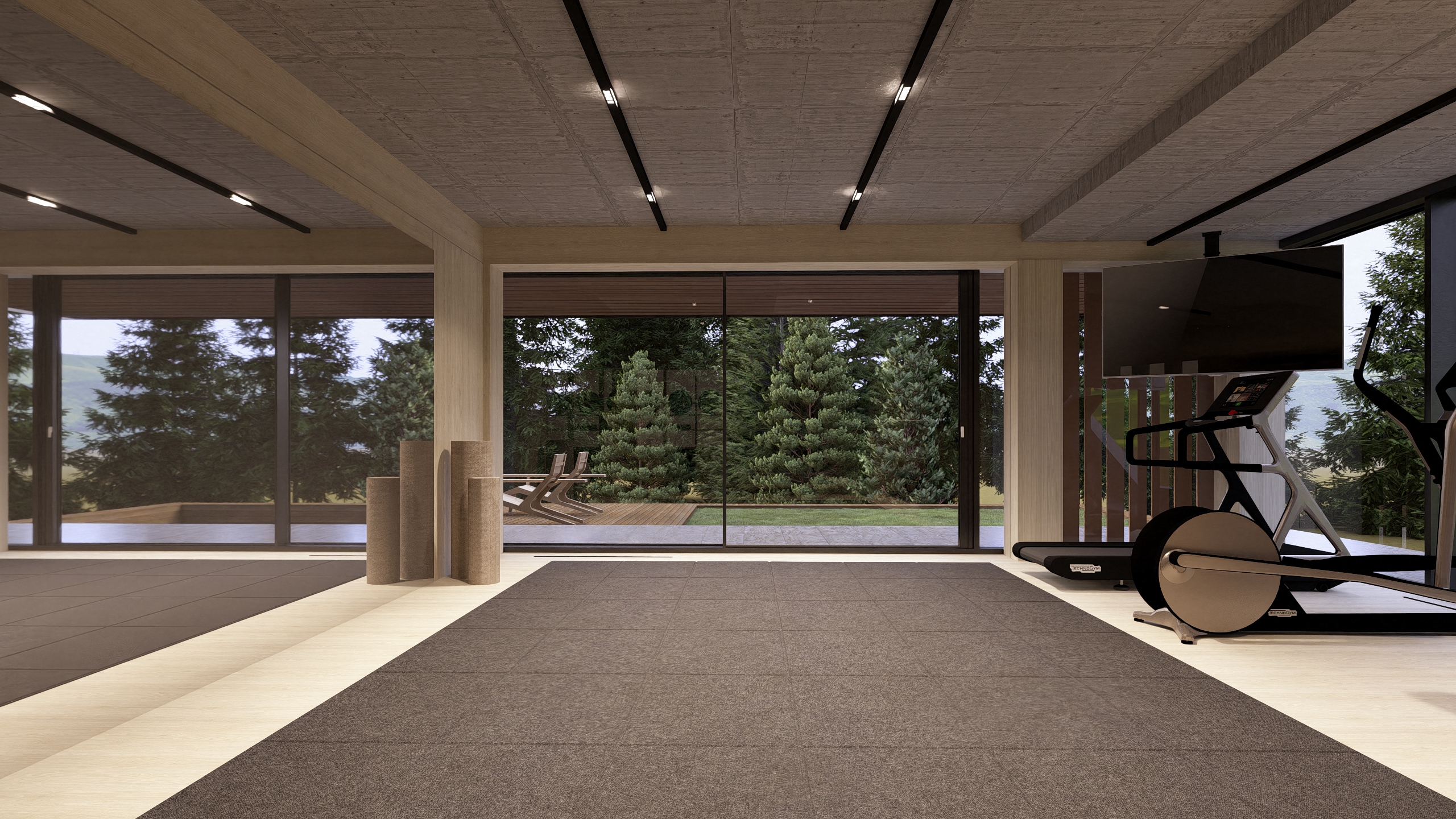 create a highly photorealistic architectural render of this gym interior visualization using the provided reference image as the exact base preserve all colors materials such as wooden panels concrete textures glass surfaces thick fabric rug on the floor with realistic fibers and subtle wear metal equipment frames and stone elements material structures wall geometries object shapes positions and overall layout precisely without any changes do not alter volumes proportions or arrangements ensure the large dark mirror prominently reflects the fitness equipment including the bench press aweczka stationary bike rowerek and treadmill bie nia with accurate perspective and lighting enhance realism with ultra detailed textures subtle surface imperfections and lifelike reflections on glossy surfaces including the mirror implement realistic lighting soft natural daylight filtering through large panoramic windows and glass doors from the outside pool area and surrounding pine trees mountains creating dynamic soft shadows god rays piercing through vertical slats warm ambient ceiling spotlights with realistic light falloff and subtle lens flares and bounced indirect light highlighting wood grains rug texture and floor details for depth and immersion render in high resolution photorealism as if captured by a professional architectural canon eos r5 camera with 50mm lens f 4 aperture emphasizing sharp details natural depth of field and atmospheric perspective architecture interior gym photorealistic