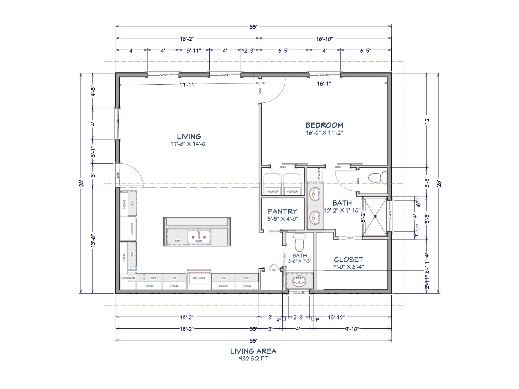 convert this floor plan into a realistic isometric 3d view of a full house show the space from an elevated angle with furniture walls and details visible keep all dimensions exact cabinetry doors windows appliances and shower placement as drawn in uploaded file cabinetry is all 42 tall white shaker style in kitchen with crown moulding on top and matte black hardware bathroom shower is white subway tile with a glass enclosure and all faucets and door handles are also matte black vanity in bathroom is white oak cabinetry elevated off the floor doorway leading into the bathroom is a pocket door there is a closet in the south wall of the bedroom windows on all sides of casita are 4 x 4 except the bathroom window which is a 3 x 1 privacy single pane towards the top of the wall all ceiling height are 9 tall throughout use the same furniture as shows on the plan do not change the orientation of the floorplan