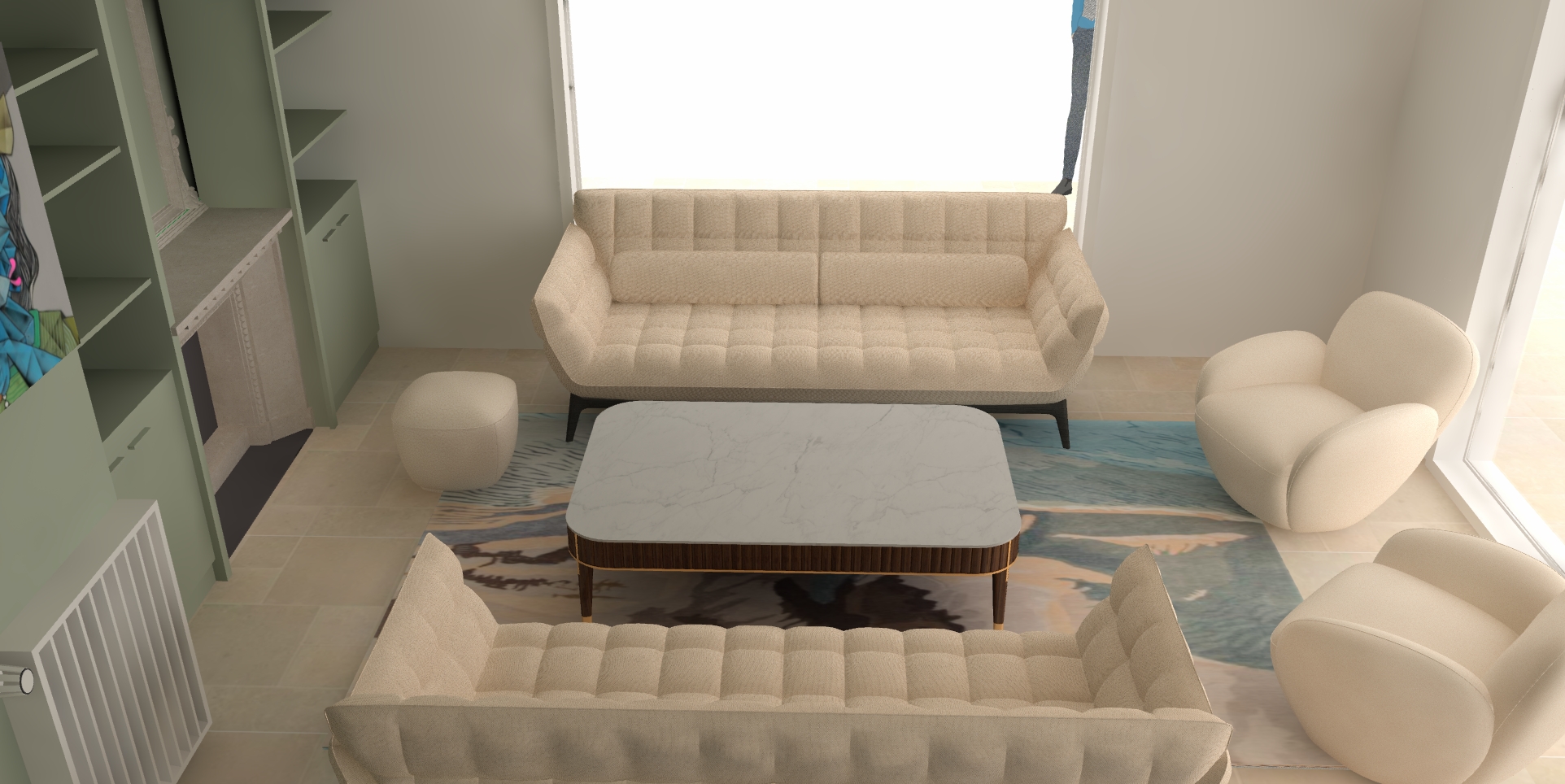 reproduis strictement cette 3d l identique sans aucune interpr tation conserve exactement les formes dimensions proportions couleurs mat riaux et implantations aucun l ment ne doit tre modifi ajout ou supprim rendu r aliste uniquement jardin derri re fenetre plus lumineux feu dans chemin e ne change pas les canap reflet sur le miroir rideaux fenetre ne change pas le tableu fentre une seule vitre miroir beige comme la chemin tisuus tissus des 2 canap un peu plus blanc ils ne sont pas en bouclette ils sont en beige ivoire et les fauteuils en bouclette legere en beige clair rajoute un chien un cocker anglais noir qui dors par terre tissus des deux fauteuils beige tr s clair comme la 3d en tissu bouclette leger le tissu bouclette met des livres et de la decoration dans les deux bibliotheque a gauche et a droite de la chemine