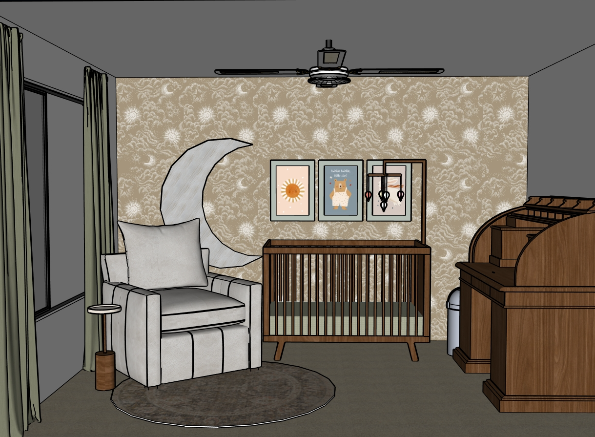create a serene and cozy nursery room use soft muted colors and natural lighting the back wall is a beige color with white celestial patterns there is a whitewashed wood moon applique on the wall the focal point is a plush cream leather recliner the crib is made of warm dark wood add a vintage wooden desk against the right wall three framed pictures above the crib a sun with a pastel orange yellow hue a bear in pastel blues and browns and a playful nursery rhyme the ceiling fan should bewhite and vintage the floor is a light brown carpet while heavy sage green drapes frame the window there is a distressed persian area rug on the floor with sage cream and blush patterns the overall atmosphere is warm inviting and calming perfect for a baby s room