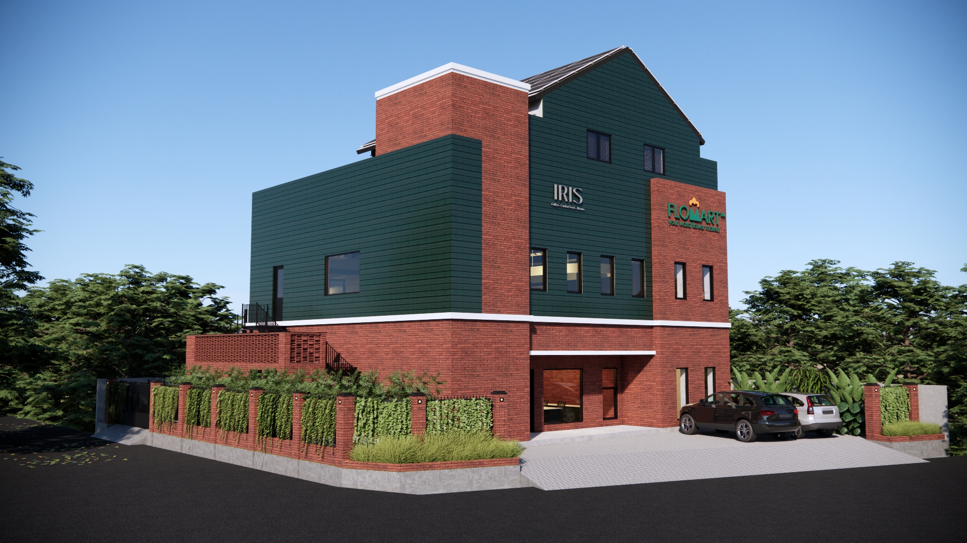 render a modern rectangular building with a rooftop and facade combining red brick and dark green panels the atmosphere is sunny with a clear blue sky set in a lush green environment include greenery on the sides and top of the fence creating a harmonious blend with nature use a smooth dark asphalt driveway with parked cars and ensure the shadows cast a realistic serene ambiance highlight the details of the windows and doors providing a polished inviting look architecture