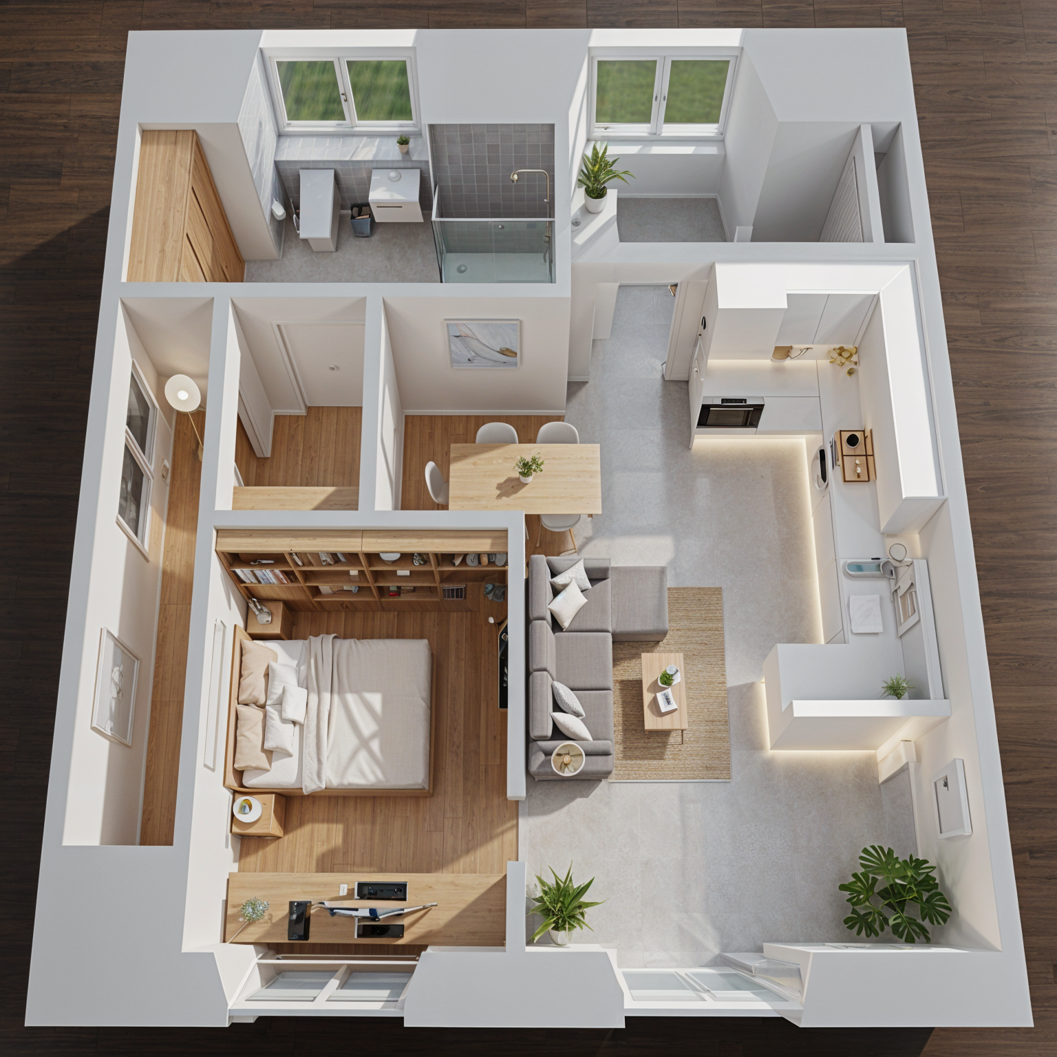 keep geometry and materials it is a clear sky with shadows the braun material on the roof is cooper the white is white plaster and the yellow on the fassade is wood planks in front of the facade are some plants with shrubs and grass