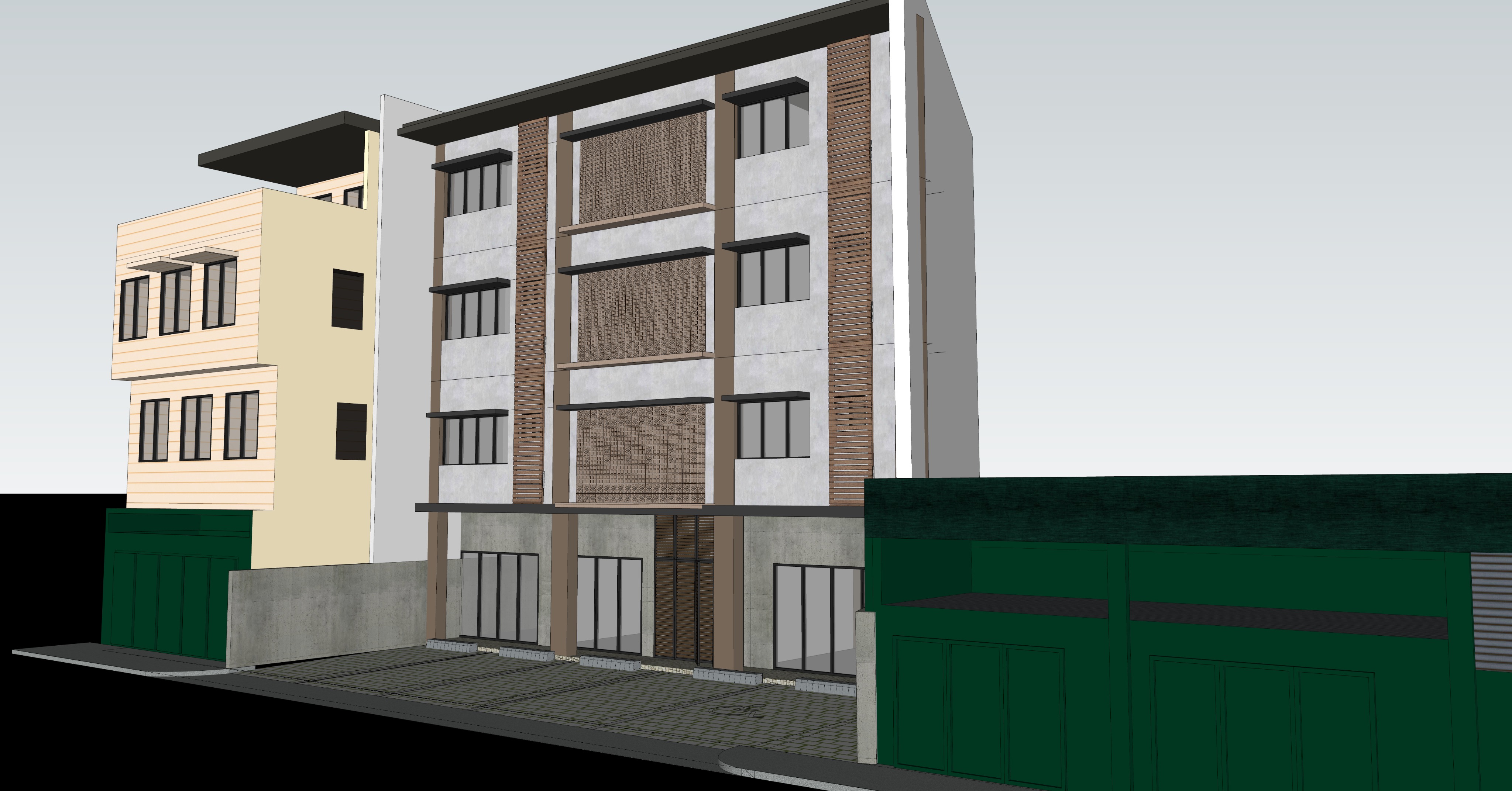 archsynth zero facade alteration strict lock objective photorealistic 3d exterior render strict architectural preservation do not modify architecture main middle building must remain 100 exactly as designed no facade redesign material color changes geometry changes added removed elements added curves added cladding added signage bands decorative upgrades massing adjustments detail simplification preserve entire facade composition breezeblock patterns depth alignment horizontal louvers window grid structural rhythm all proportions and spacing architecture accuracy visual enhancement only improve lighting realism environment weather street realism parking fixed exactly 5 parking slots right side pedestrian strip 1 planter within strip no added removed slots wider slots extended parking pedestrian redesign planter relocation context location private residential street busy philippine city road 6 5m two way time clear tropical daytime lighting warm philippine sunlight soft shadows sky blue with tropical clouds add electric posts overhead wiring street lights subtle under canopy lighting atmosphere modest lived in everyday not upscale adjacent buildings no redesign left 4 storey residential dark green gate slight 5 year aging right 1 storey warehouse green gates slight aging keep original form exactly ground floor main building commercial units no signage bands large signboards added facade features visible interiors small parlor salon chairs mirrors simple lighting small caf small tables simple counter warm modest lighting exterior signage minimal only vehicles only inside 5 slots no street parking vehicle type common philippine sedans small suvs mpvs no luxury or high end brands upper floors residential facade unchanged add subtle realism curtains soft reflections light interior shadows no geometry changes mood mid level mixed use philippine building balanced natural daylight slight street life not crowded not cinematic not dramatic not high end final rule no facade redesign no architectural reinterpretation no parking changes no added elements enhance realism only never redesign do not change the pattern of the breezeblocks