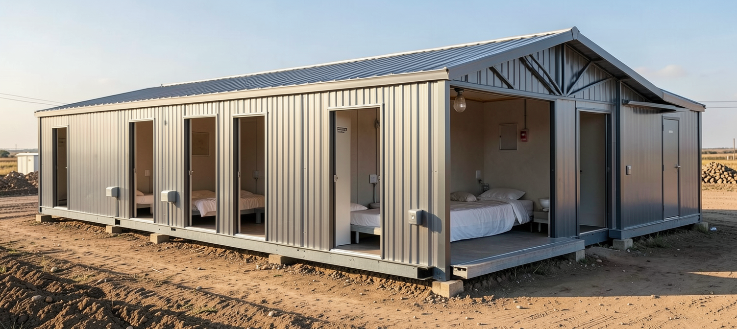 render this floor plan into a modular unit to be used at man camps in the texas desert stand and seam roof and walls