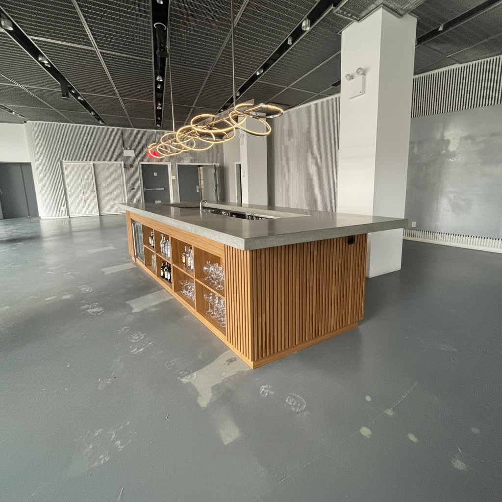 add an stone island bar the final image should appear to have been photographed in the same venue as the reference images with the same design aesthetic maintain the visual structure of the input image
