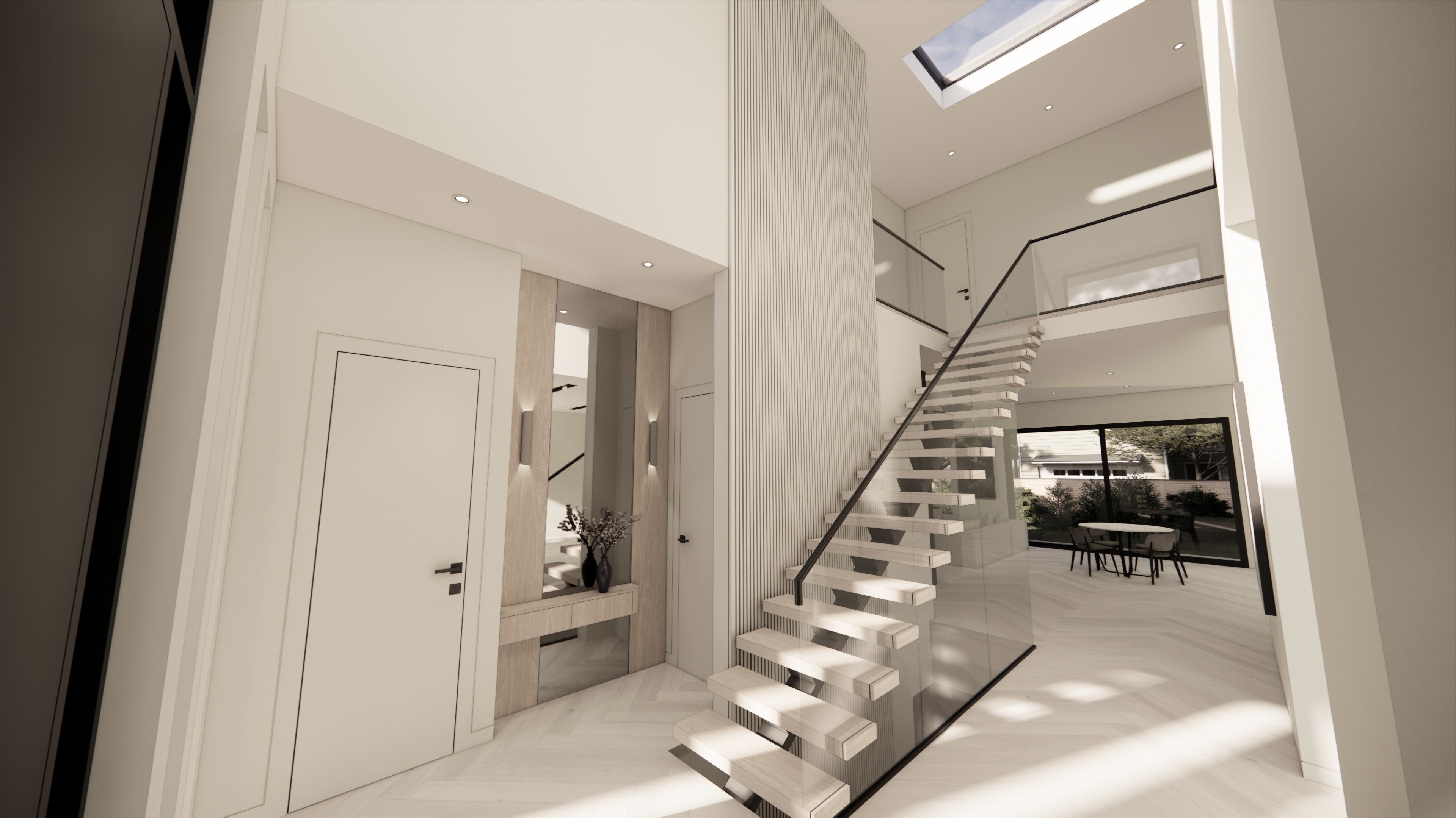 light white oak herringbone hardwood for floors and same color of wood for stair steps feature wall behind the stair is white fluted panel