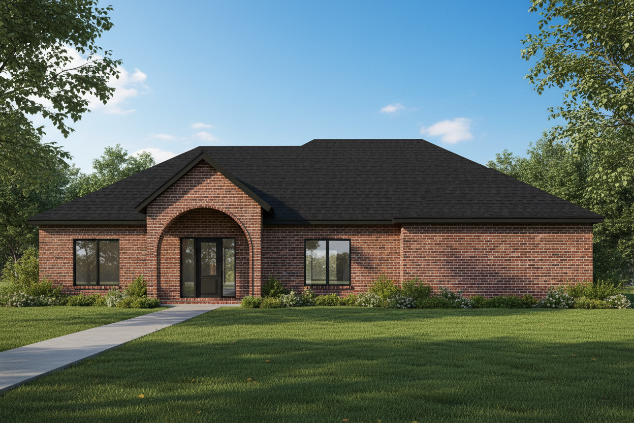 a charming single story house with a classic brick facade painted in a warm beige color the roof is covered in charcoal gray shingles the front door is a rich mahogany color adding a touch of elegance each window is framed in white providing a crisp and clean contrast the atmosphere is serene and welcoming with soft golden sunlight casting gentle shadows on the house lush greenery surrounds the house and a clear blue sky stretches above