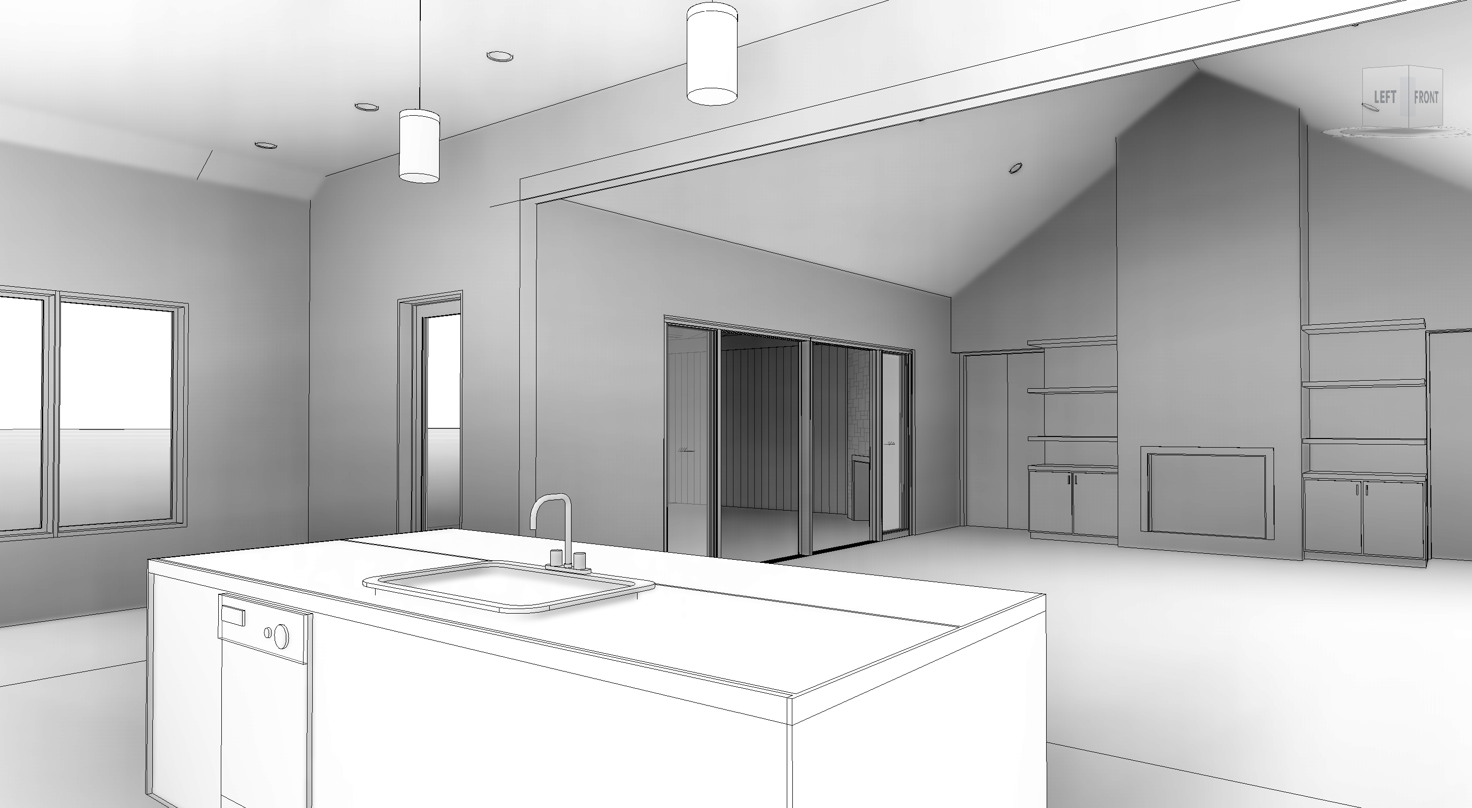 interior rendering of modern farm house with white oak cabinet and bi uilt in and beams on the slopped ceiling white stone on fireplace