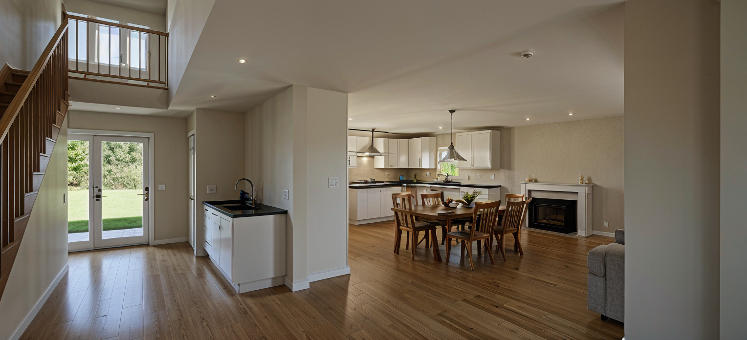 minimalism exterior shot evening rendering white wood siding on the upper floors glass storefront on the ground floor architecture